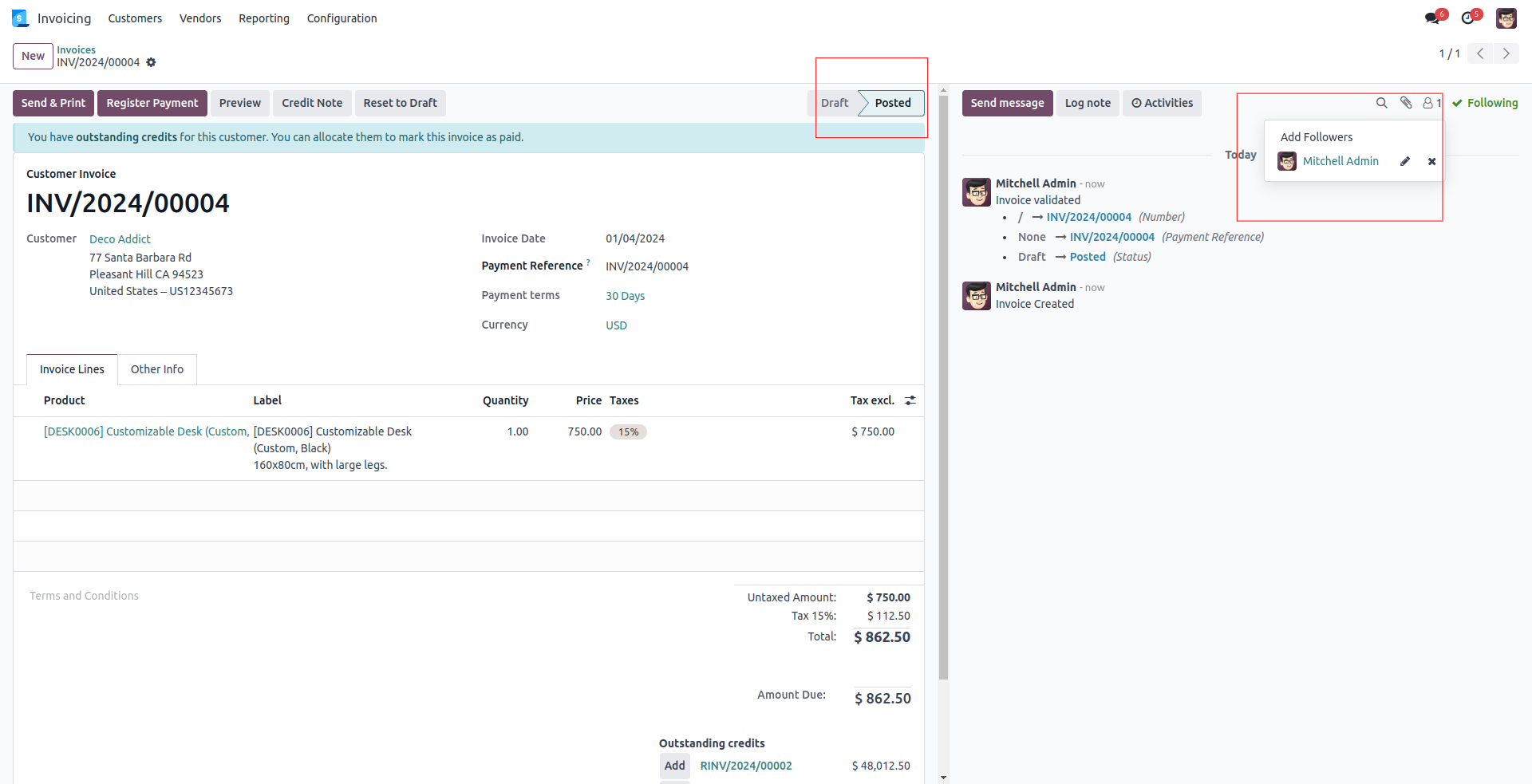 While confirming a Invoice, we can see that only the user is added to the follower. Here the customer is restricted to be a follower.