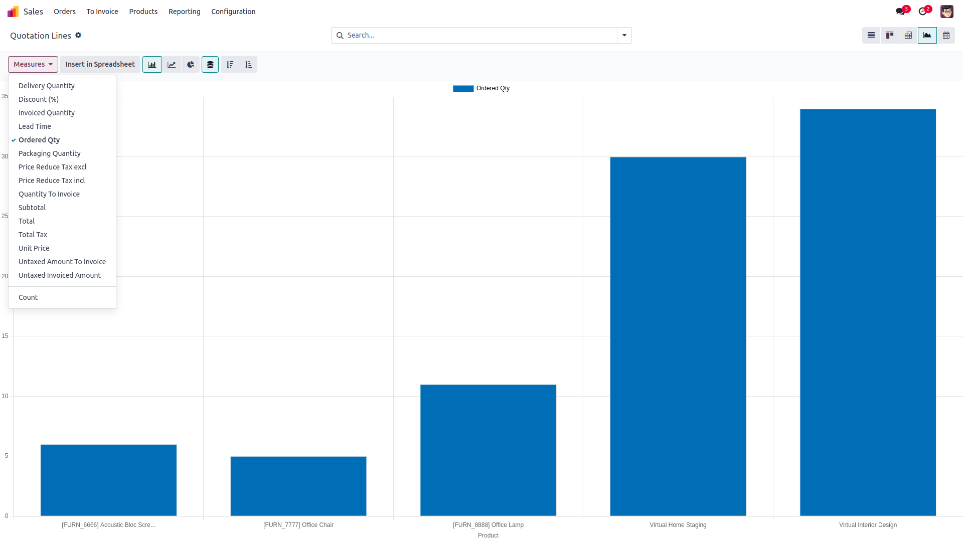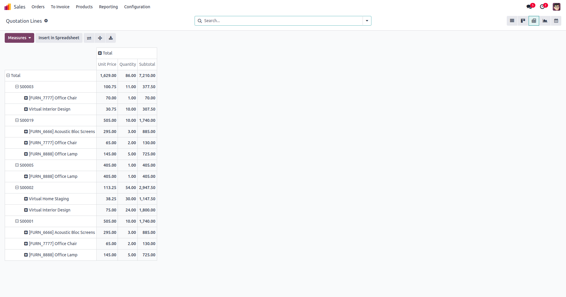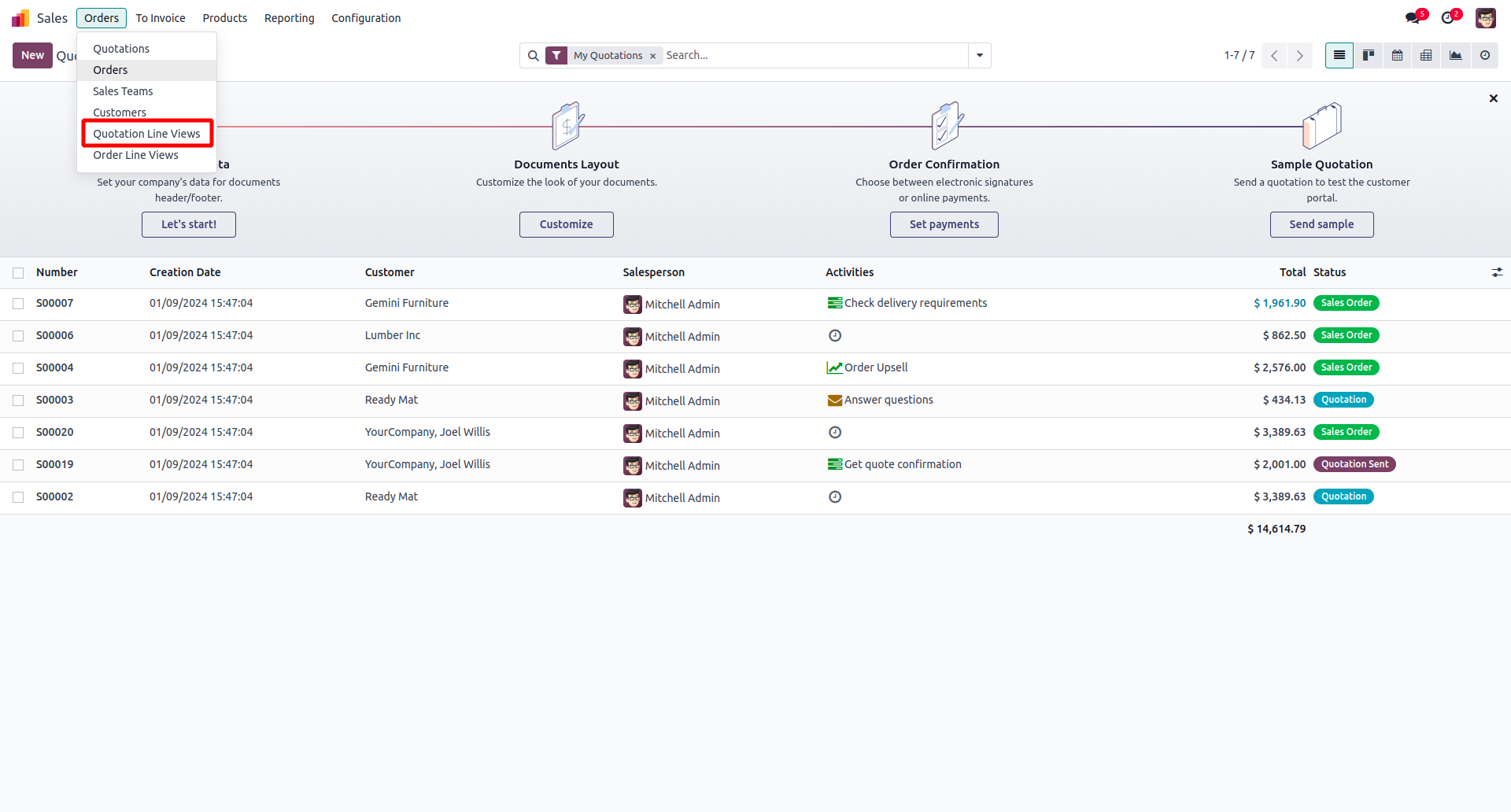 Sale order/quotation details can be viewed in different views like, list view,form view, kanban view, search view, pivot view, graph view and calendar view.