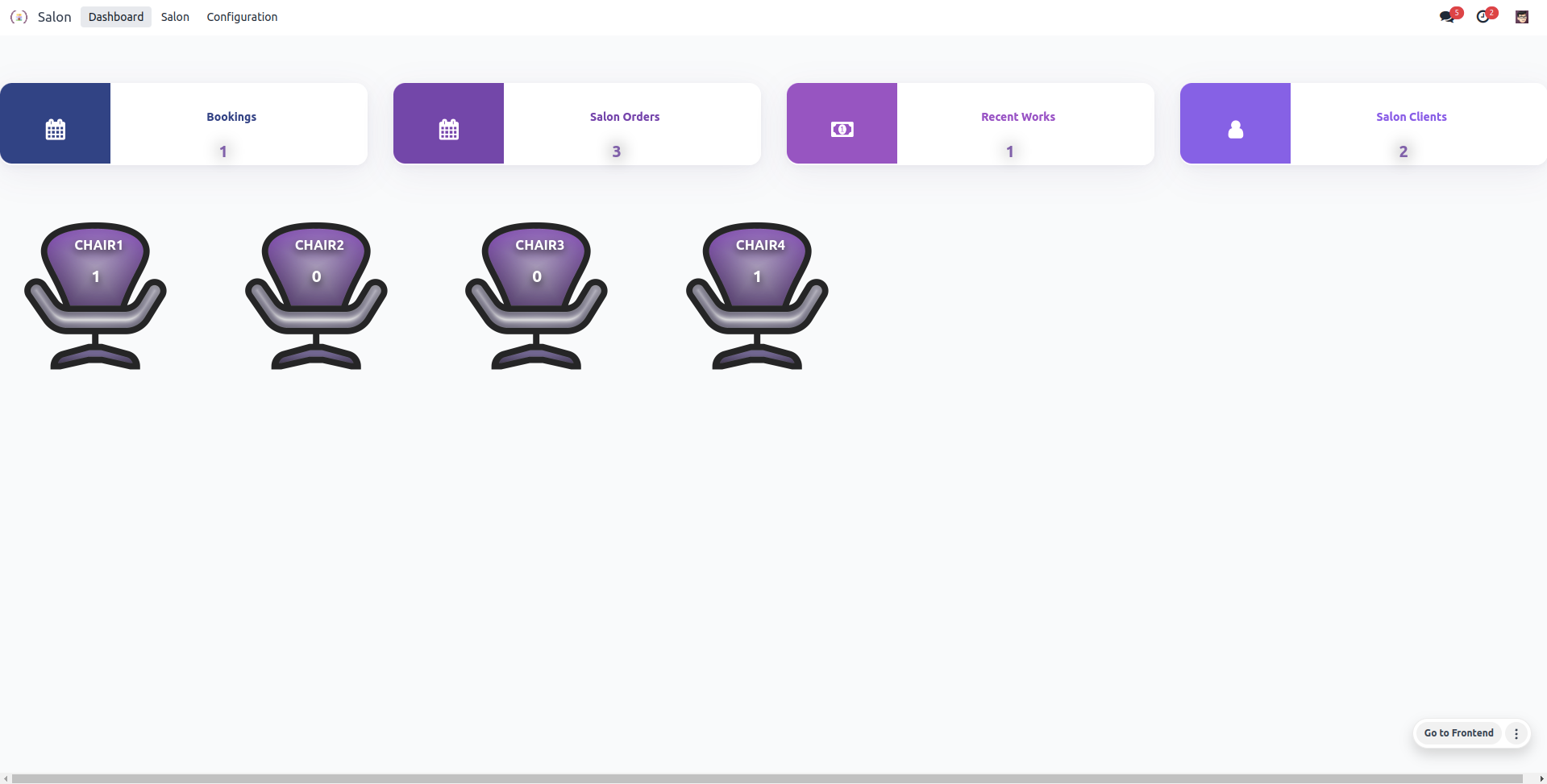 You can see all the salon orders in different stages in the kanban view. The salon order for the chairs, which are not available for online booking, can be created from here. The stages of the salon orders can be changed by dragging and dropping the salon orders in different stages. The list view for the salon orders is also there.