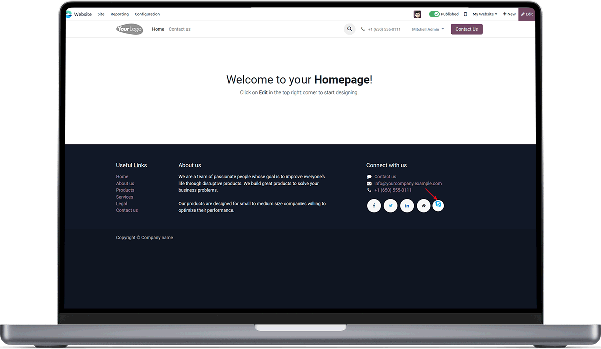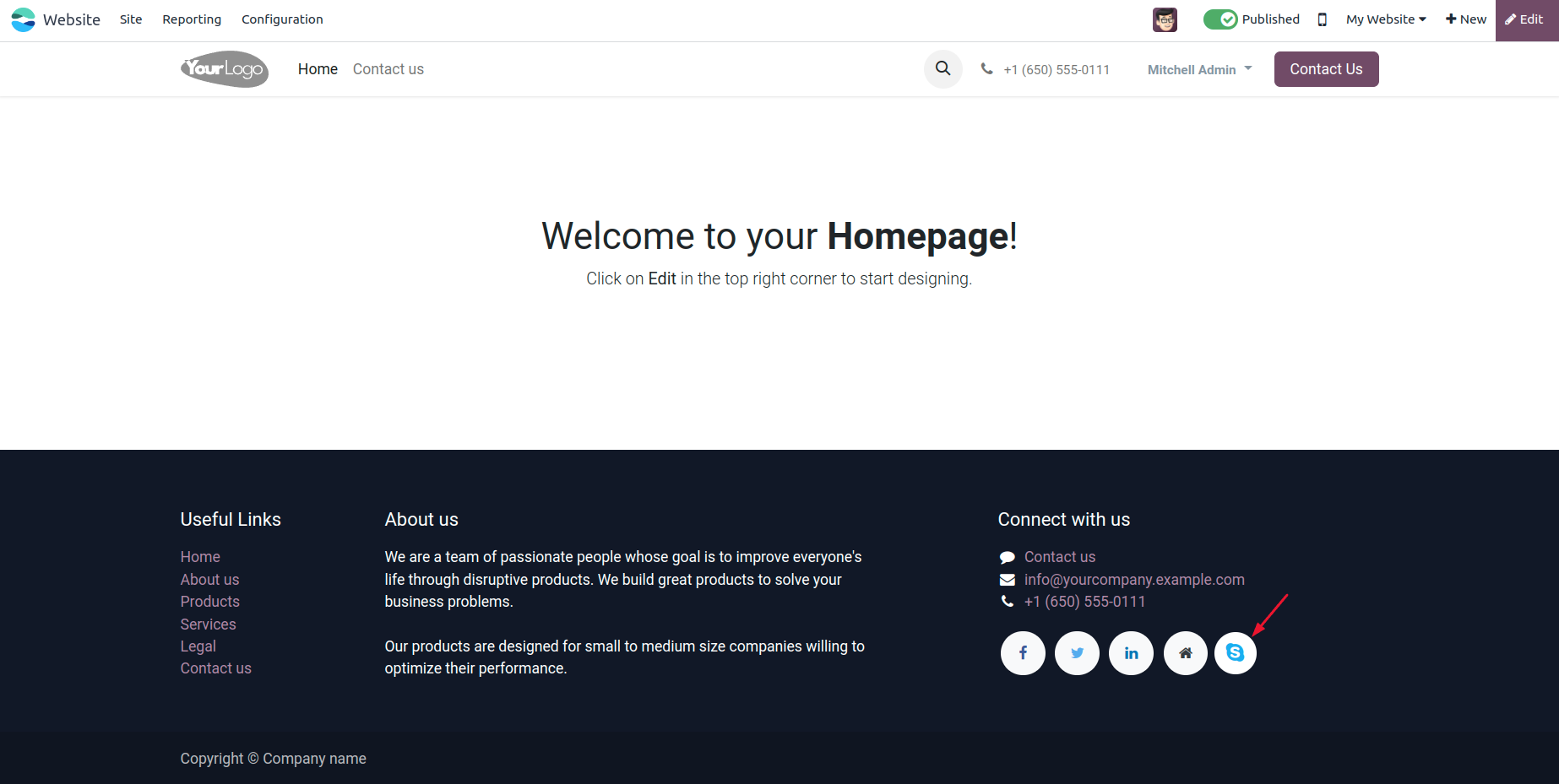 After enabling the Skype in settings, you can view the Skype icon in the footer section of your website