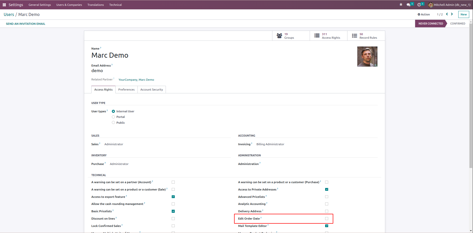 First we have to set the user groups for editing the field 'Order Date'. For that go to the 'General Settings'. General Settings -> Users & Companies. Select the user who can edit the field. Under the 'Technical' section enable the 'Edit Order Date' and save the record.