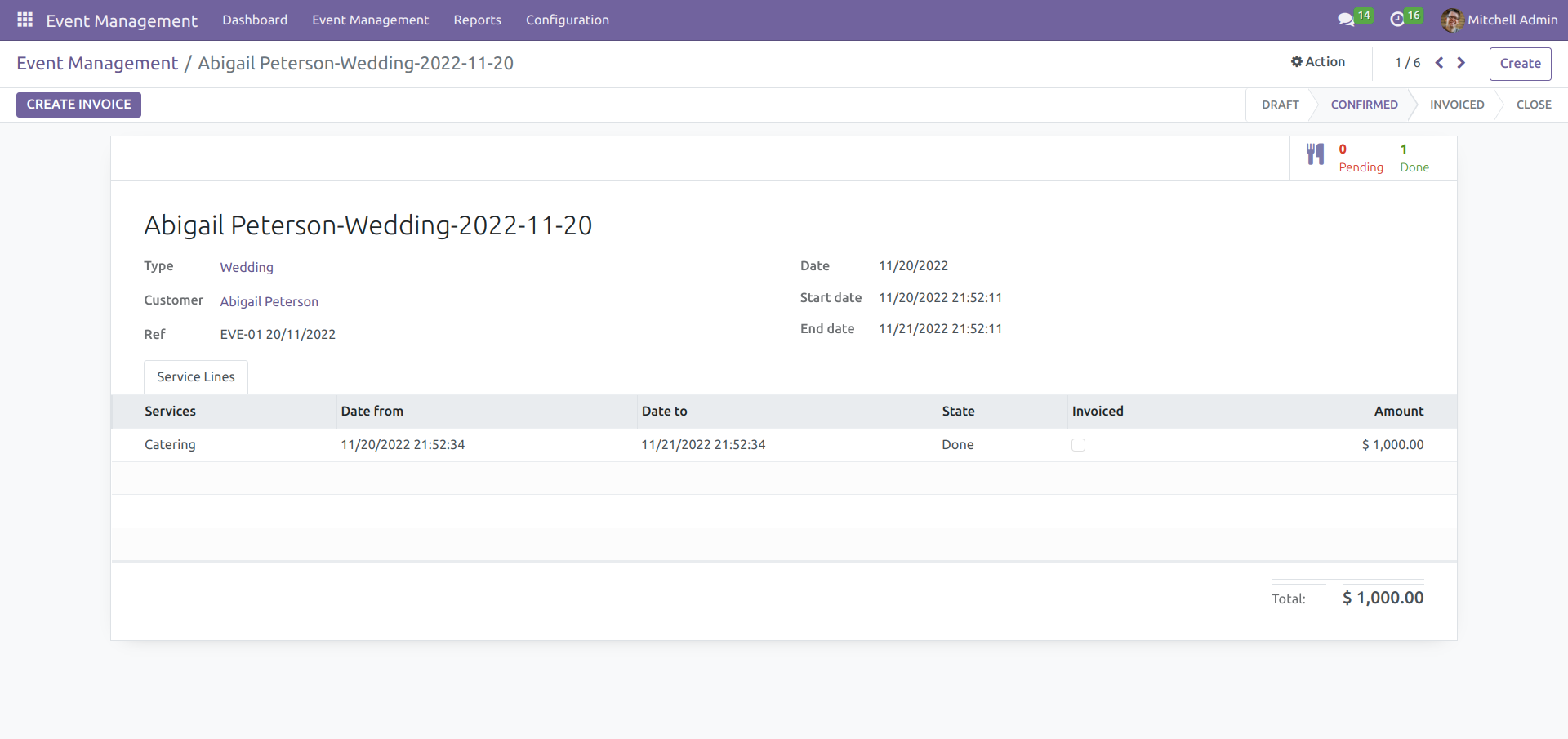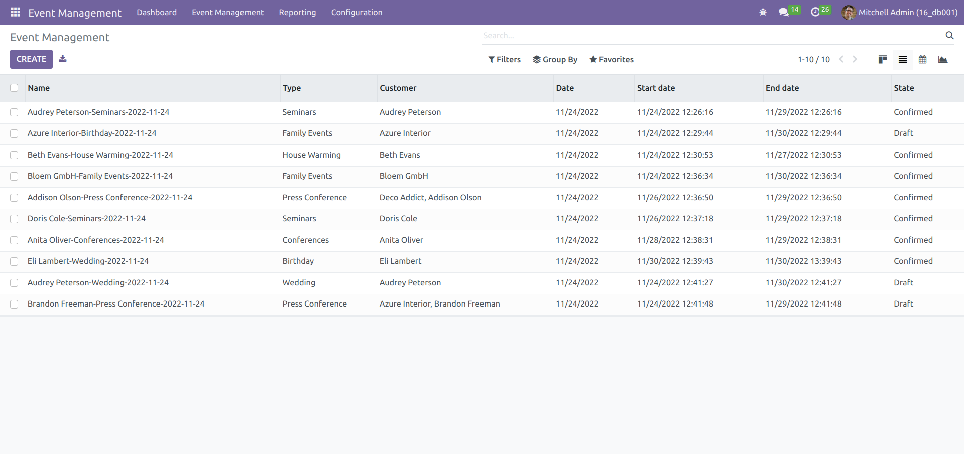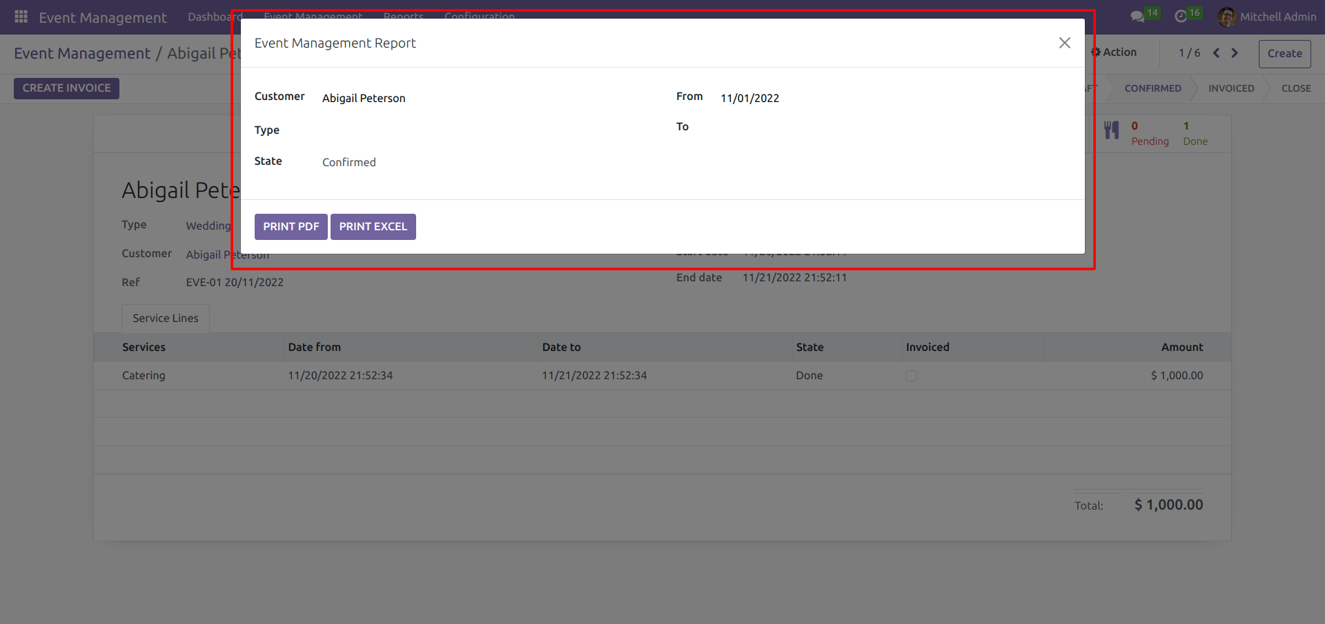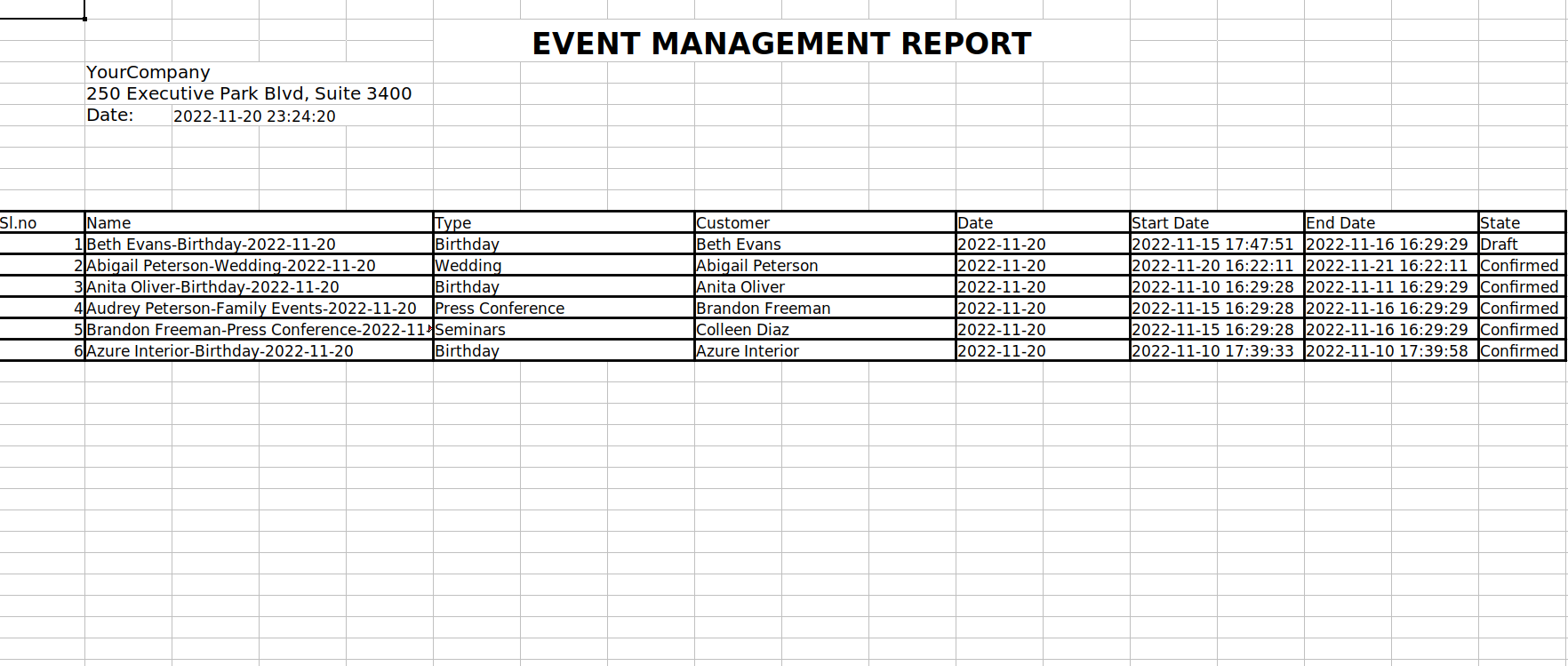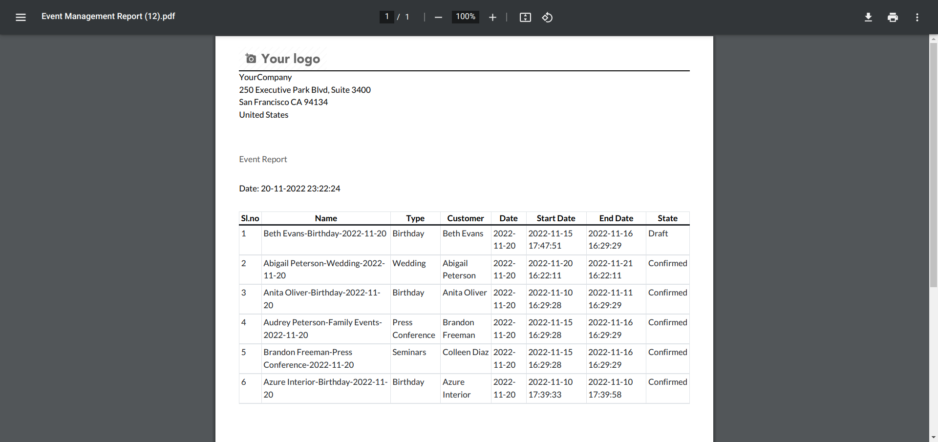 Can print pdf and xlsx report with several details including Customer, Event type, State and also based on Dates.