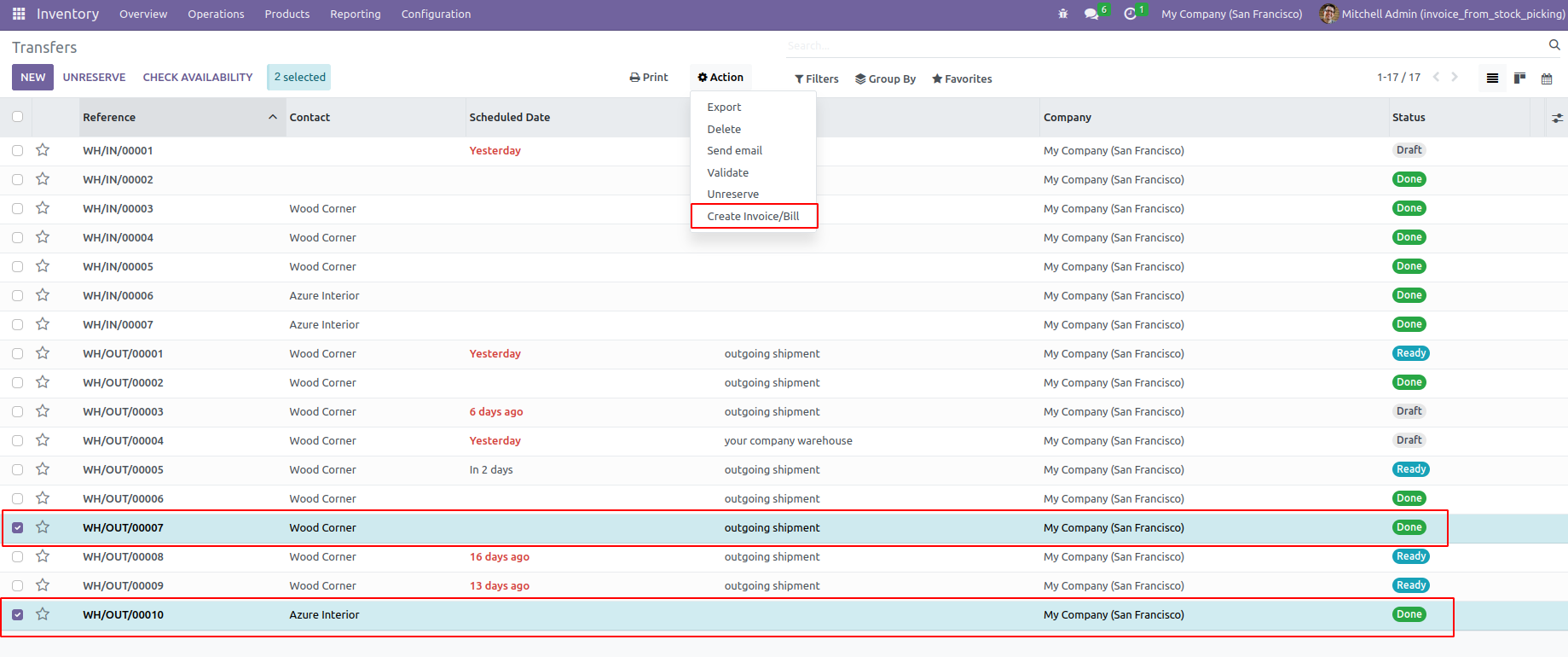 select multiple transfer with same transfer type and with different partner from the tree view. It will create a single invoice/bill for each transfer.