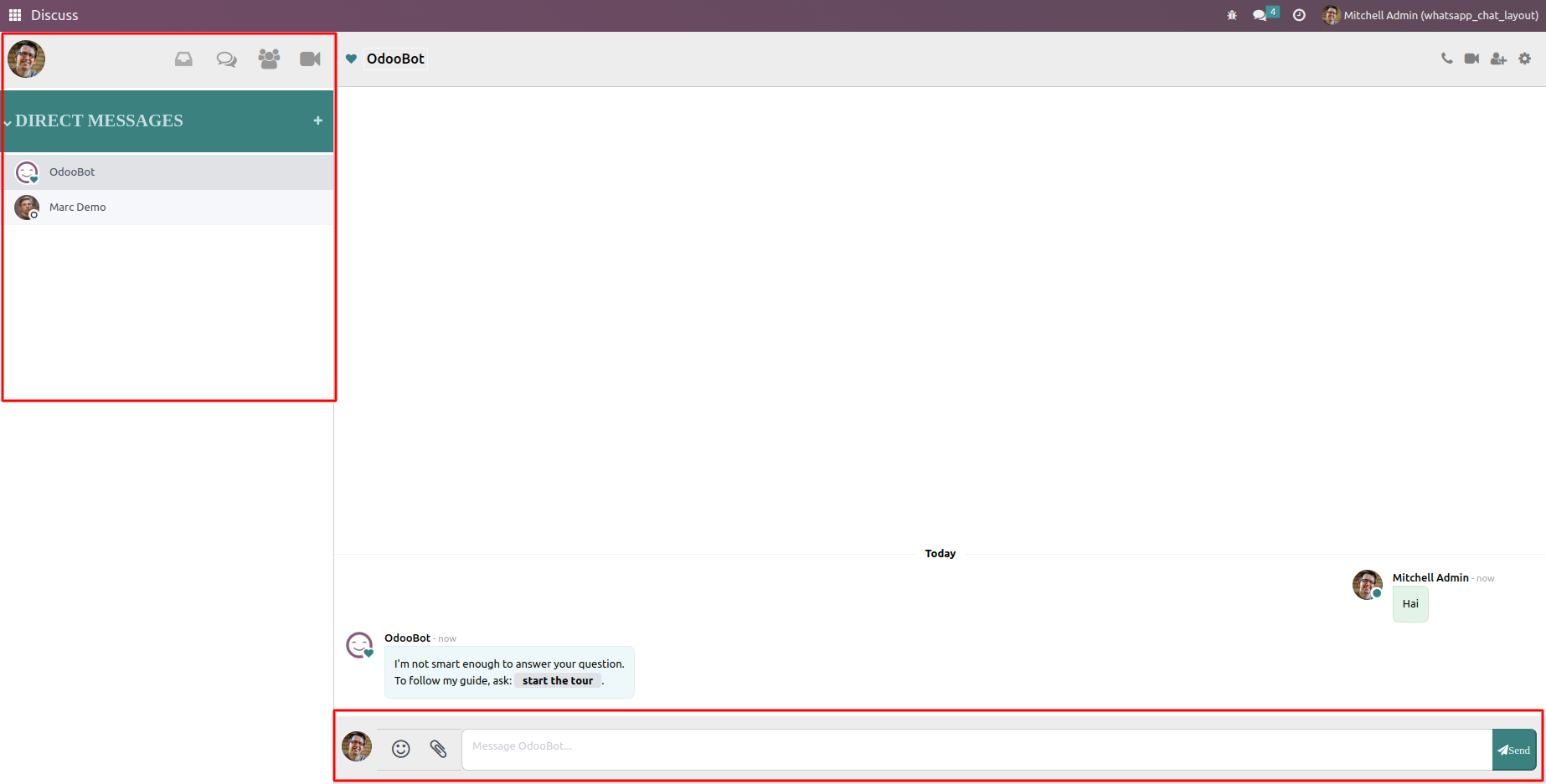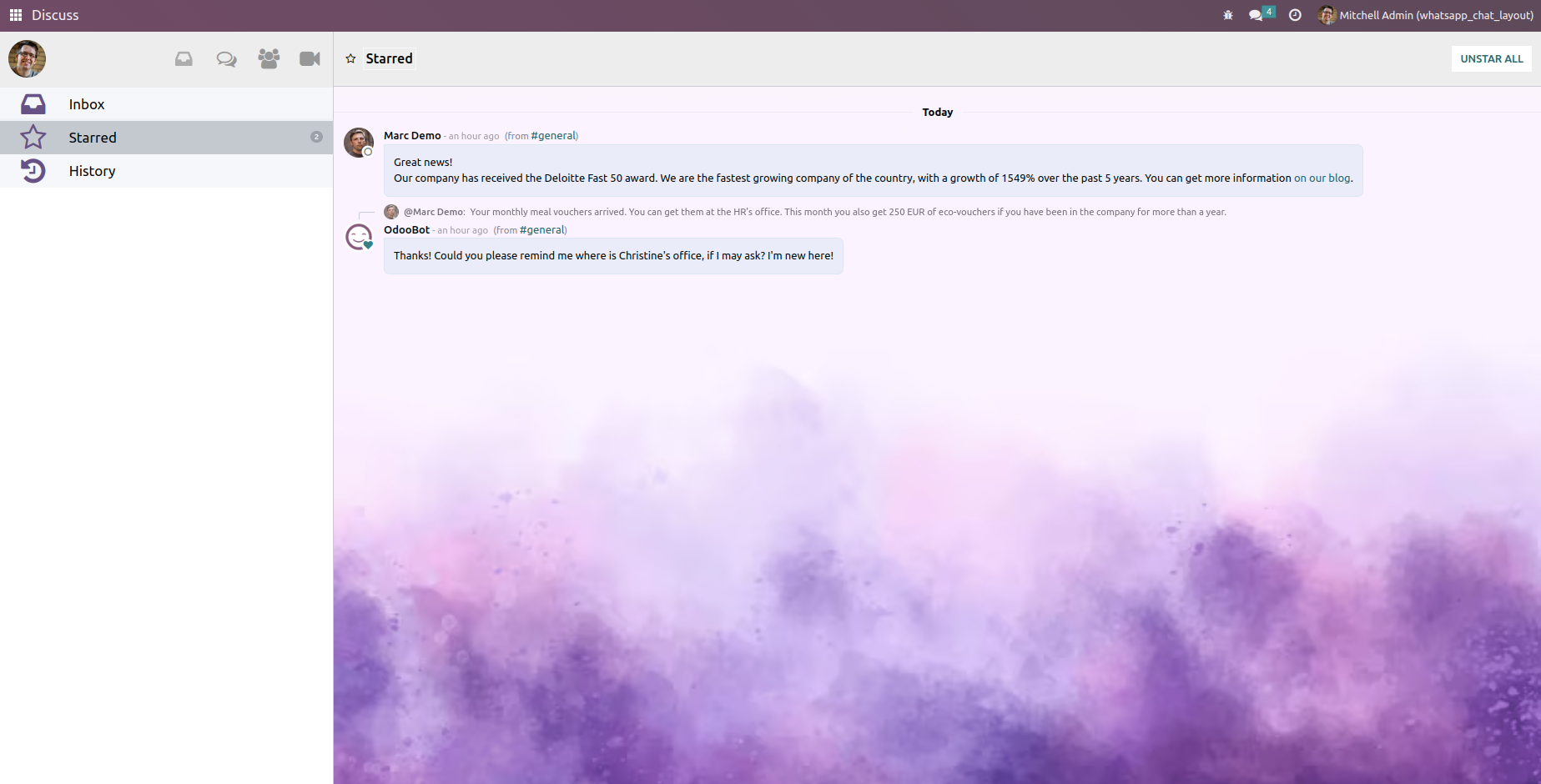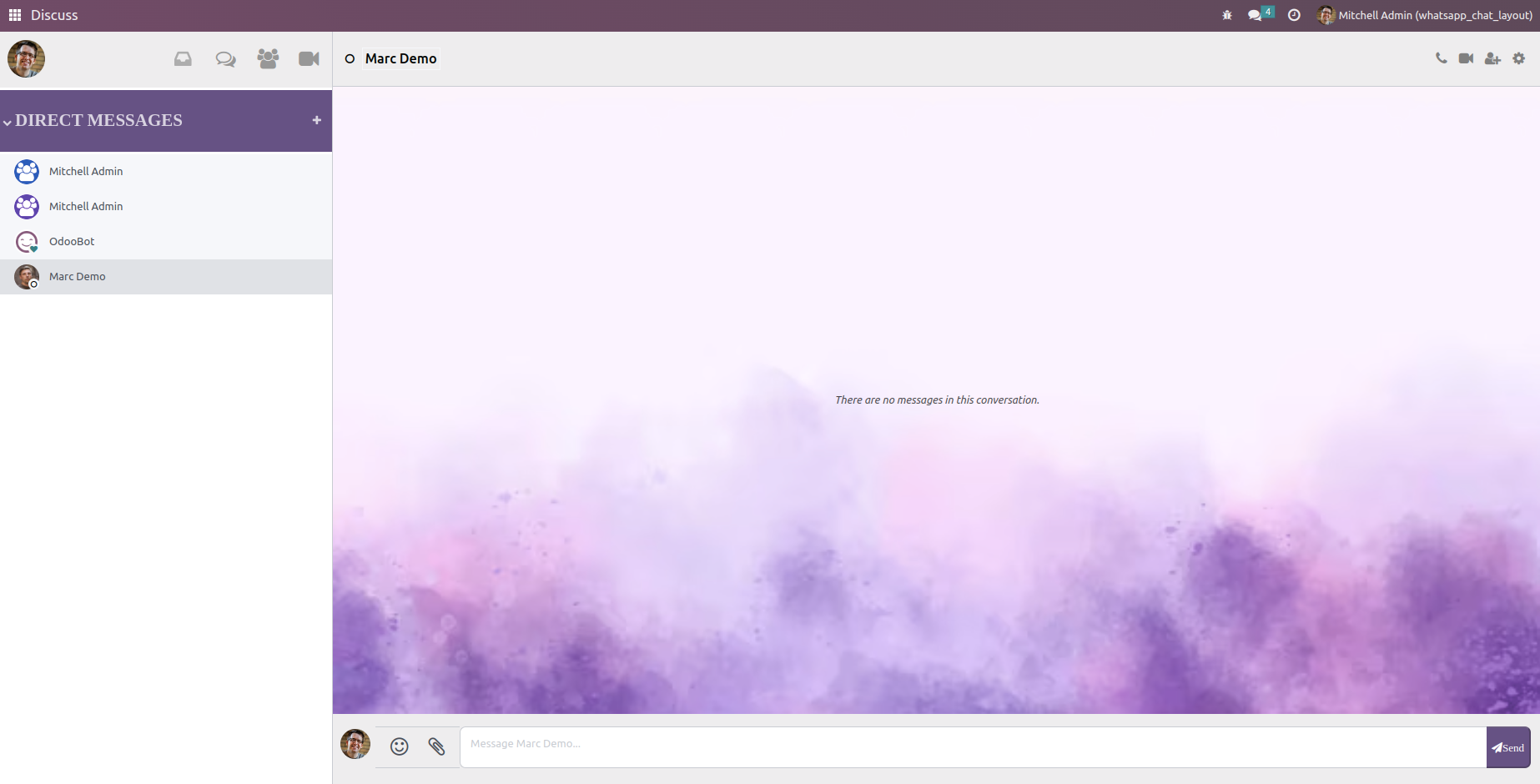Whatsapp Chat Layout in Odoo Discuss module Redesigned the discuss module into whatsapp chat layout.User can change the background color and layout color of the discuss module. And also set background image.