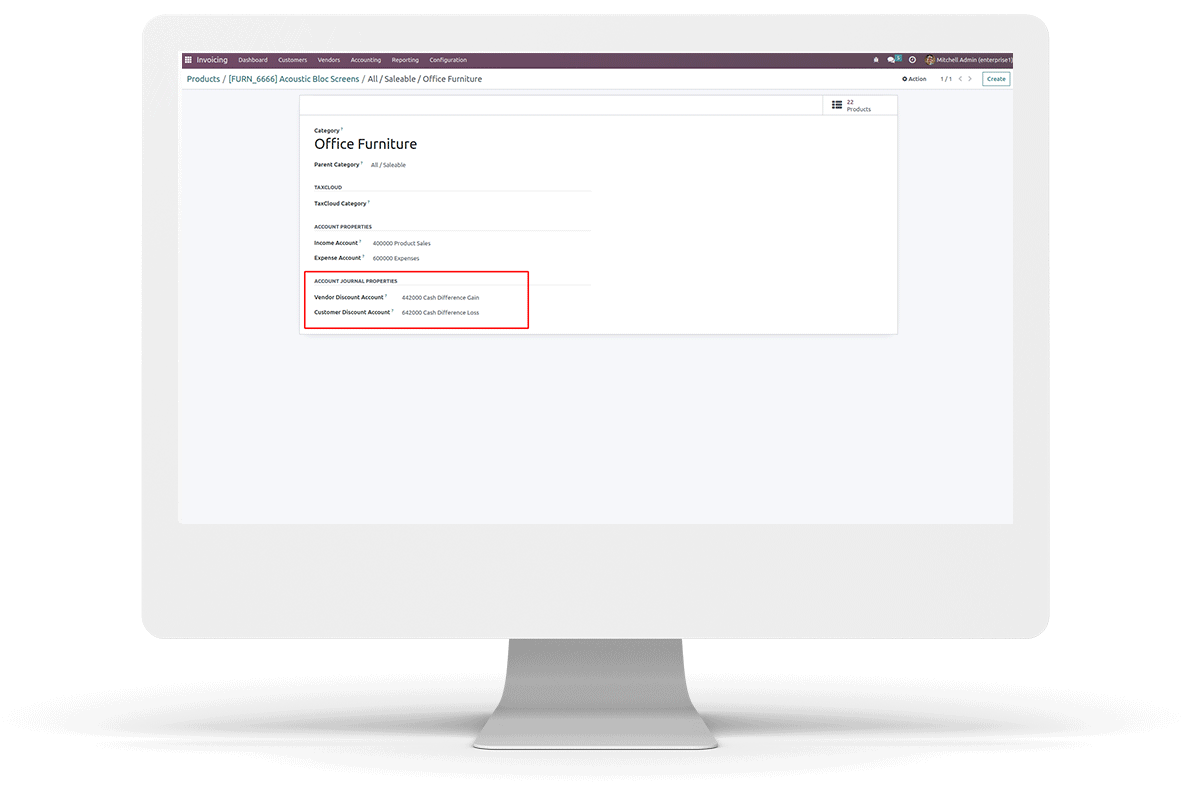 Select preferred account for customer and vendor discounts. (If empty, journal items are not created). In the case of customer discounts in invoices, the account configured inside product categories will reflect debit transactions and the account for product sales will reflect credit transaction. Similarly, for vendor discounts in bills, the account configured inside product categories will reflect debit transactions and account for expenses will reflect credit transactions.