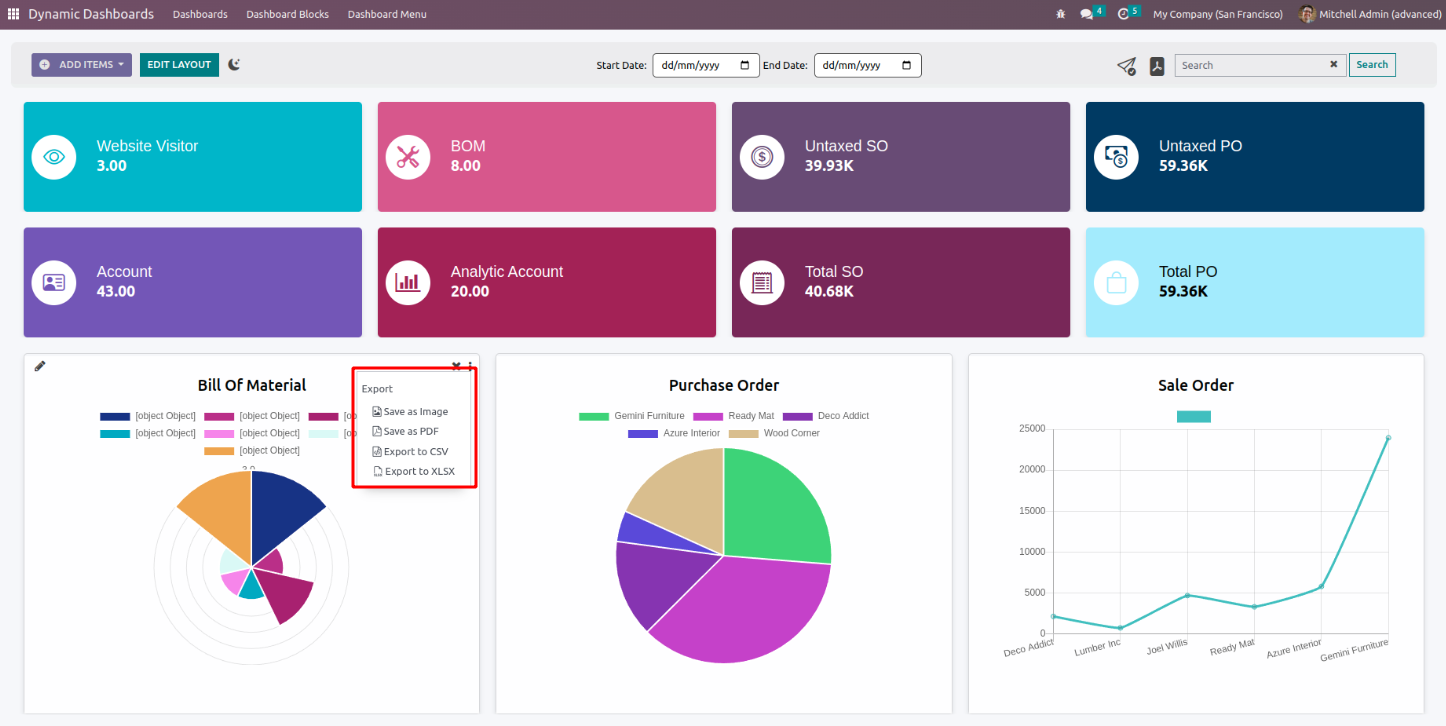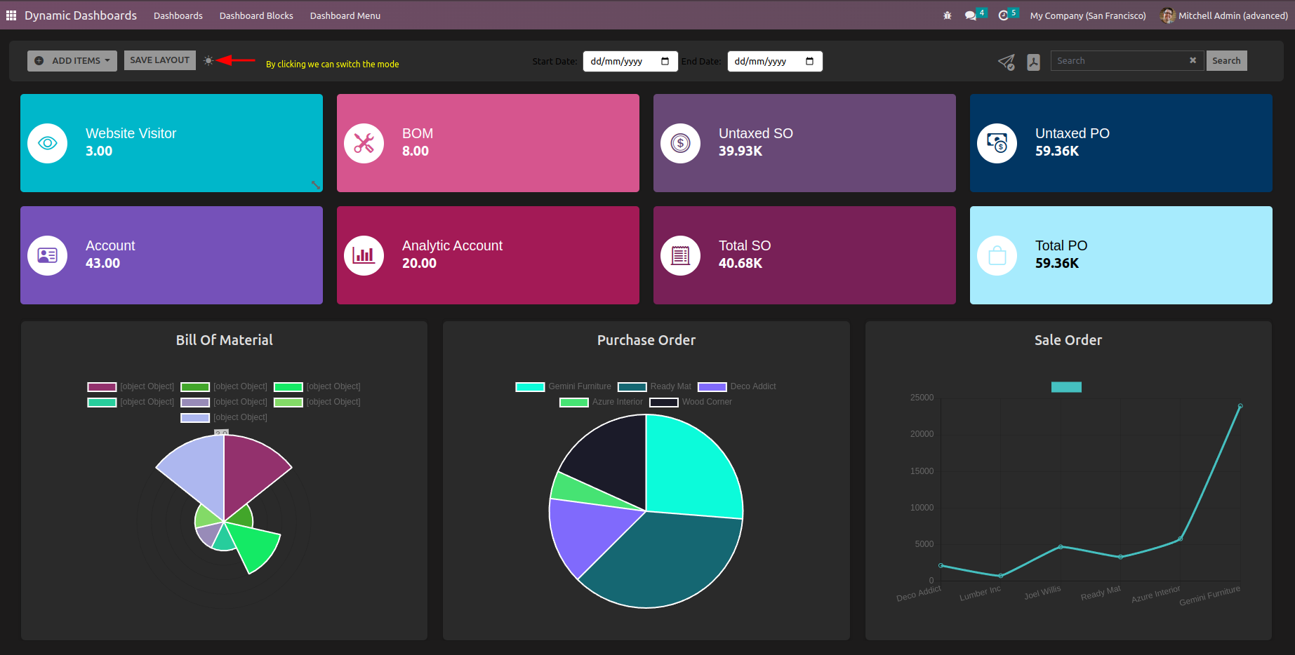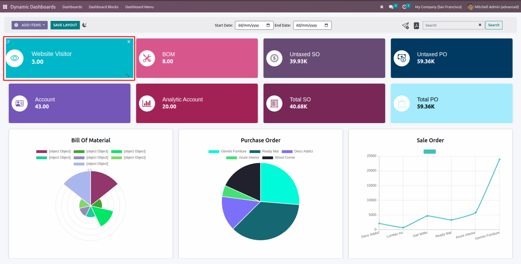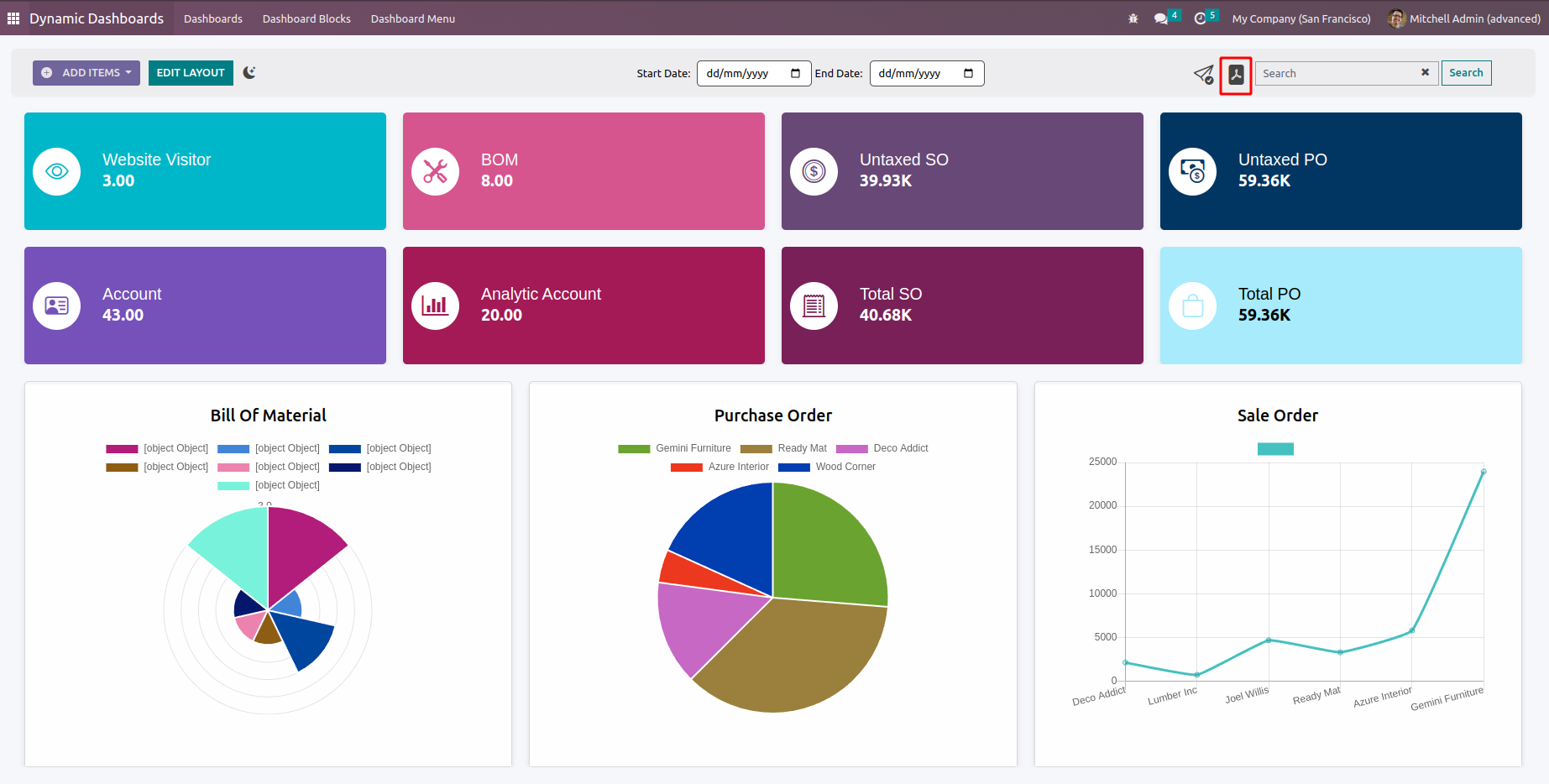 Dynamic Dashboard module helps to Arrange the dashboard to get the information that are relevant to your business, department, or a specific process or need.