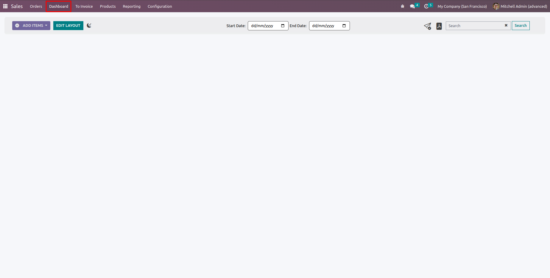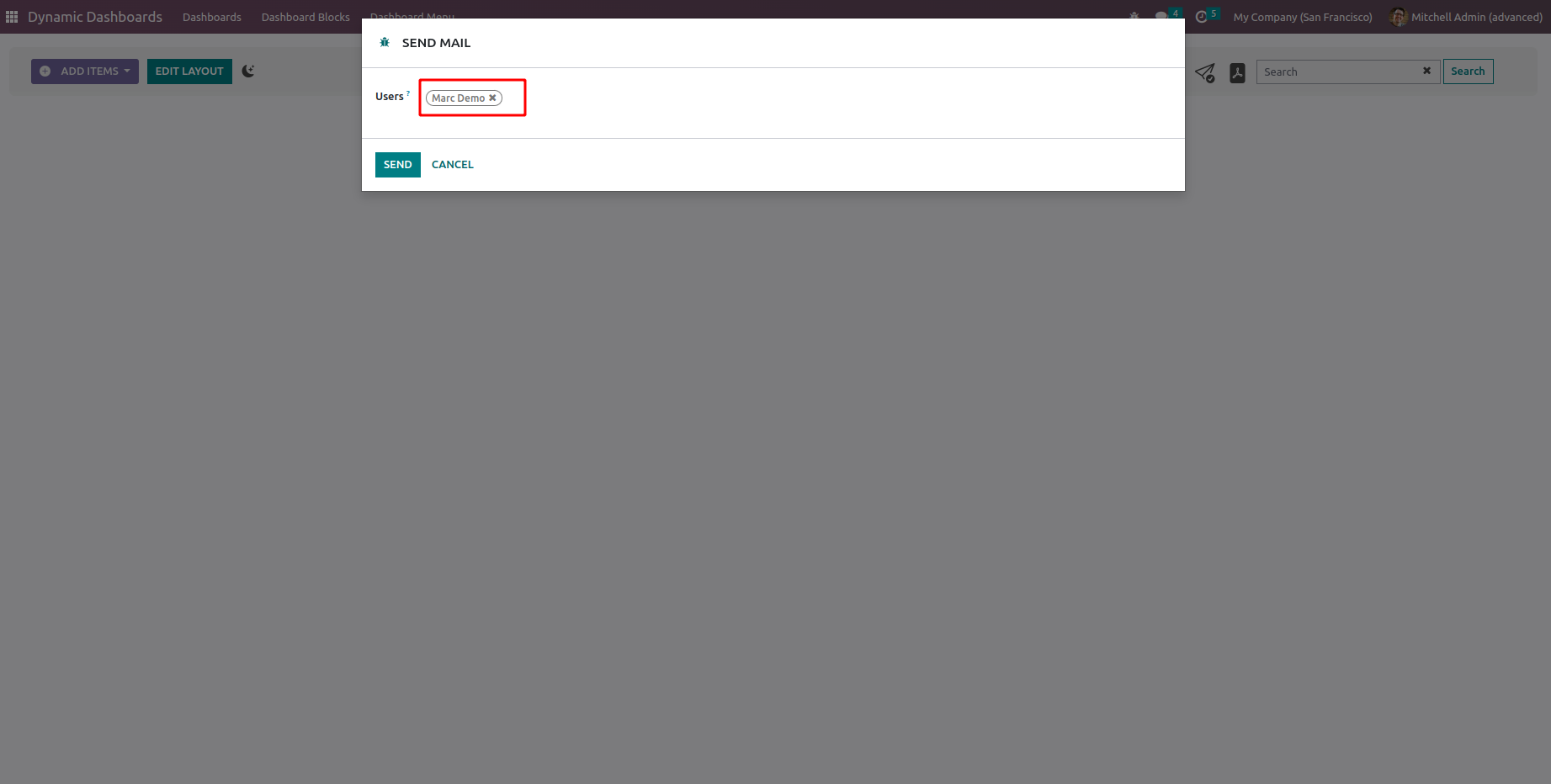In Advanced Dynamic Dashboard menu you can easily add item, edit layout, change mode, print pdf, send mail to users with attachment and search item also.