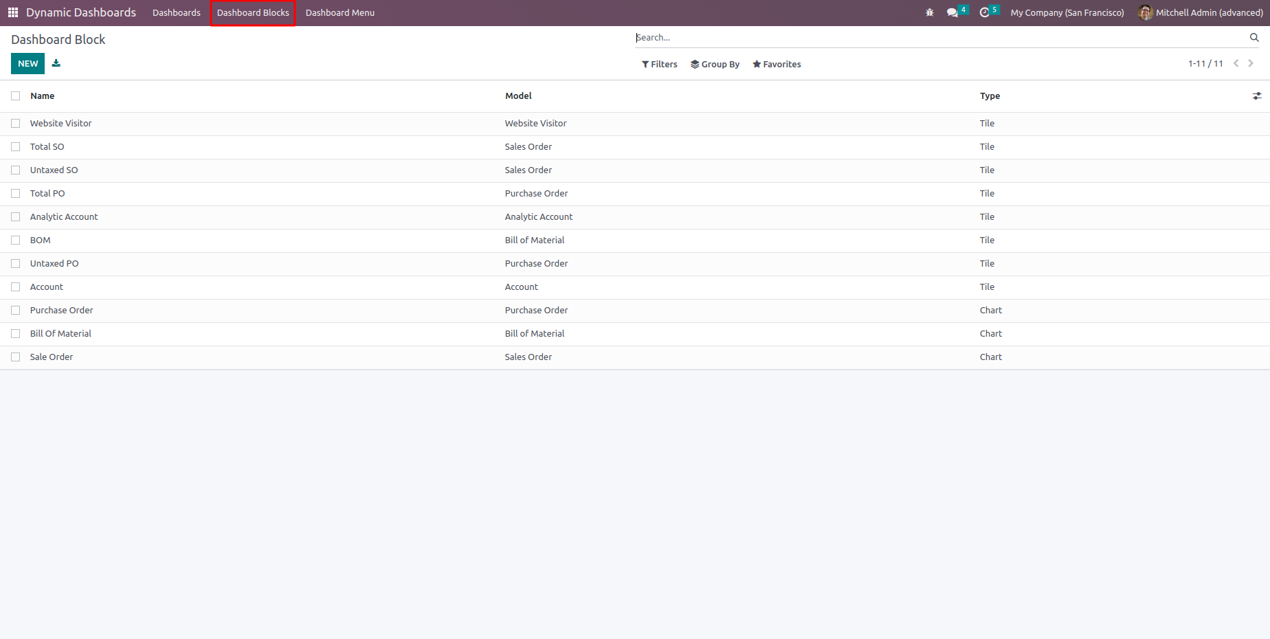 You can see all the tiles and charts created in the Dashboard Block menu.