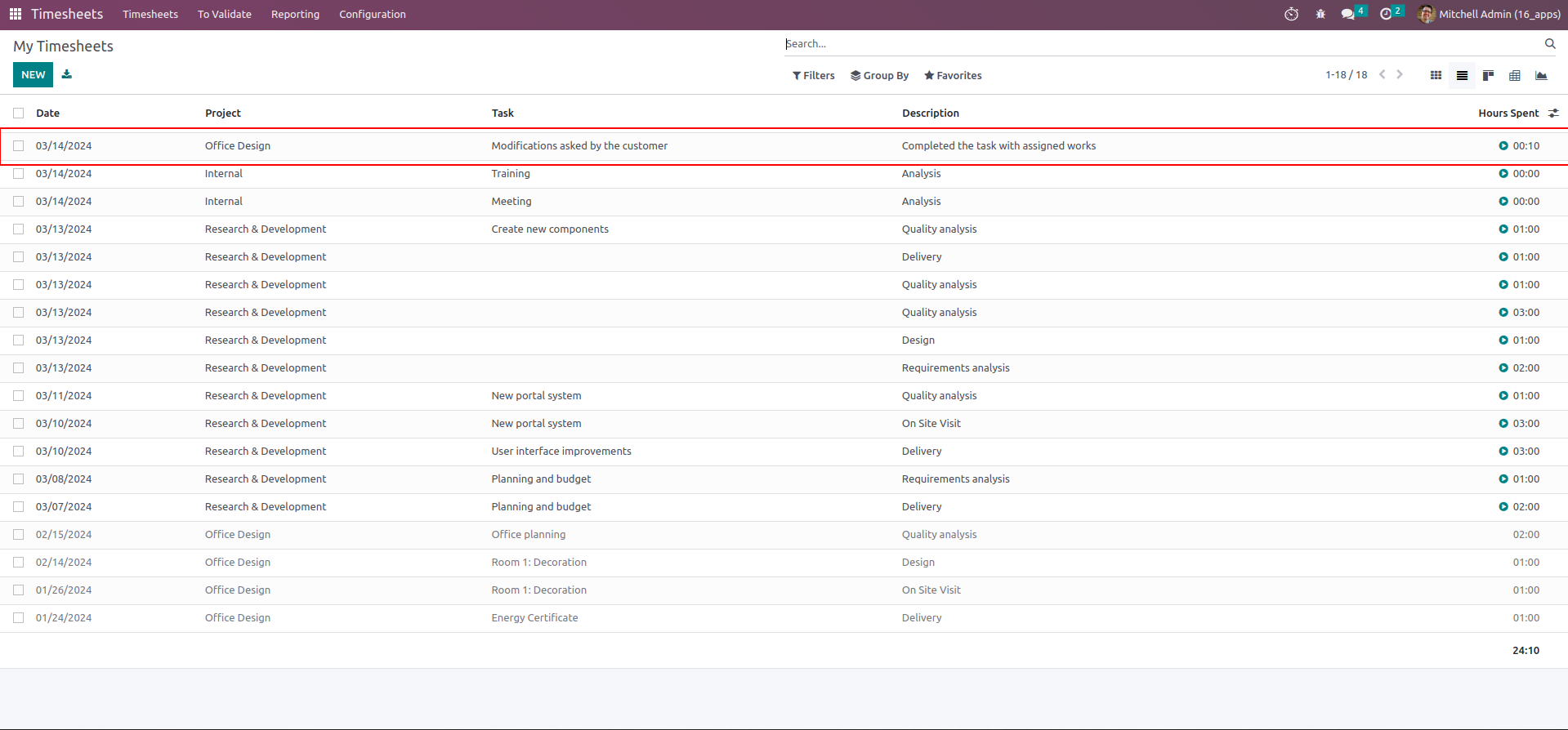 Timesheet will be created for selected project and task with given description