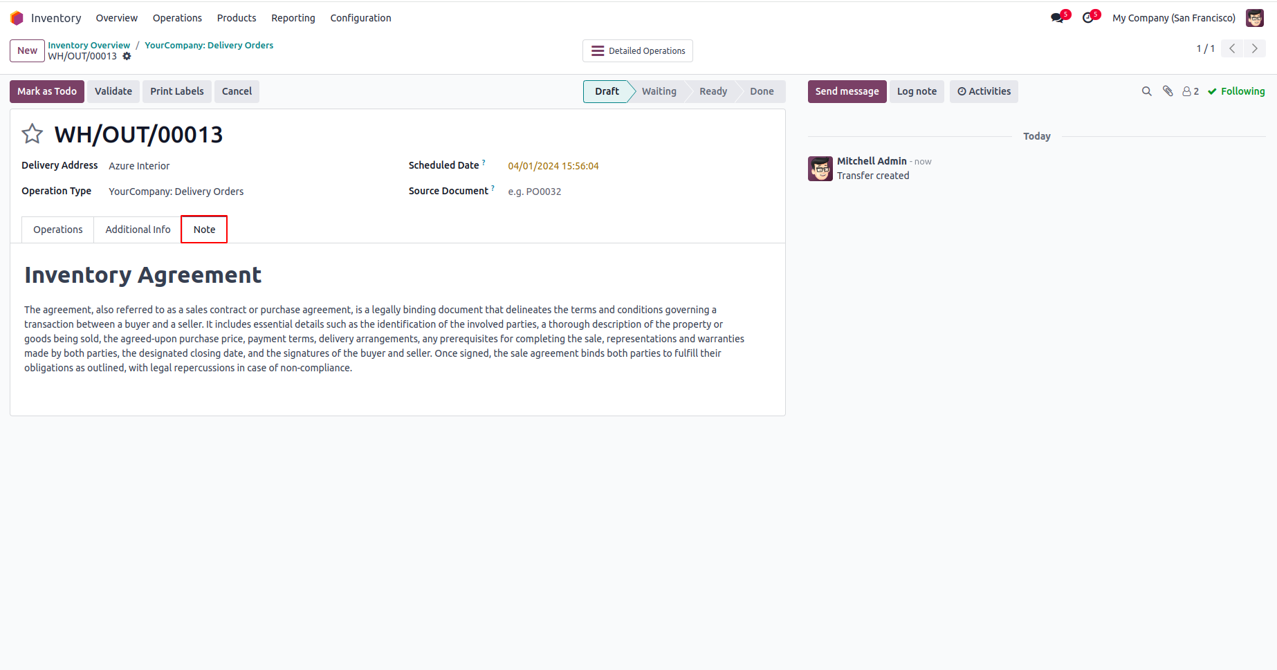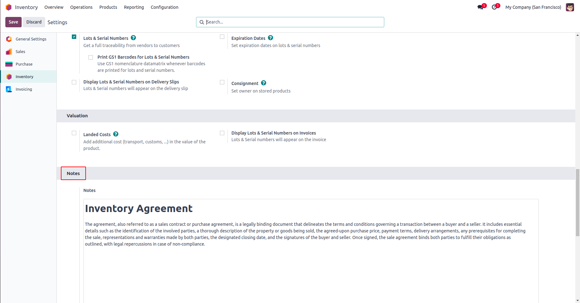Setup HTML notes in configuration and used this default notes or customized notes in sales,purchase,invoice and inventory form view and also used this notes in reports.