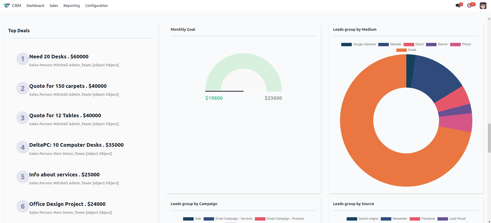 The Top Deals listing will help the Salespersons to promote them easily without moving to the sales module. Moreover, the Top Deals can be listed out based on the custom ones which are being defined. The Monthly Goal Gauge will provide insight on the targets and the achievement rate of each of the Salesperson.