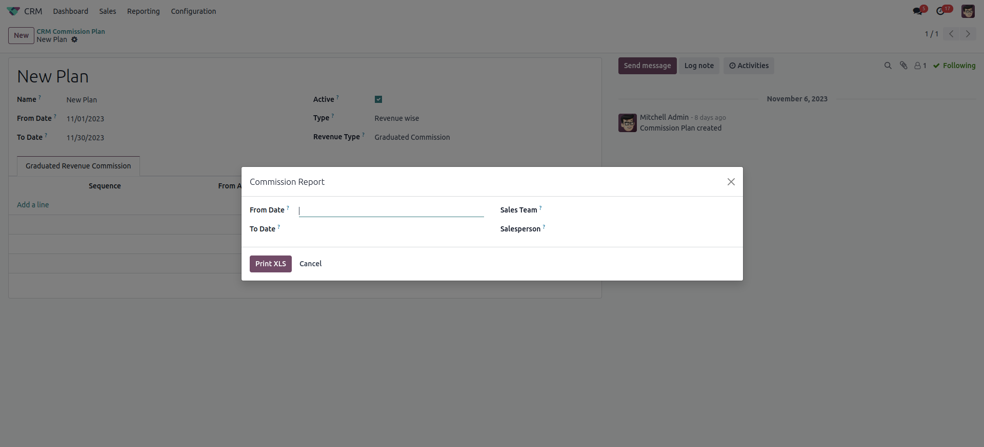 While Creating a Graduated Revenue Commission Plan the Commission type can be selected as Graduated Commission. Further, the commission rate can be defined under the Graduated Revenue Commission tab.