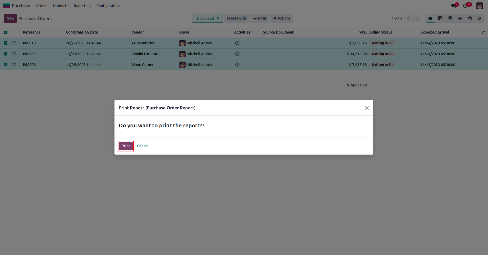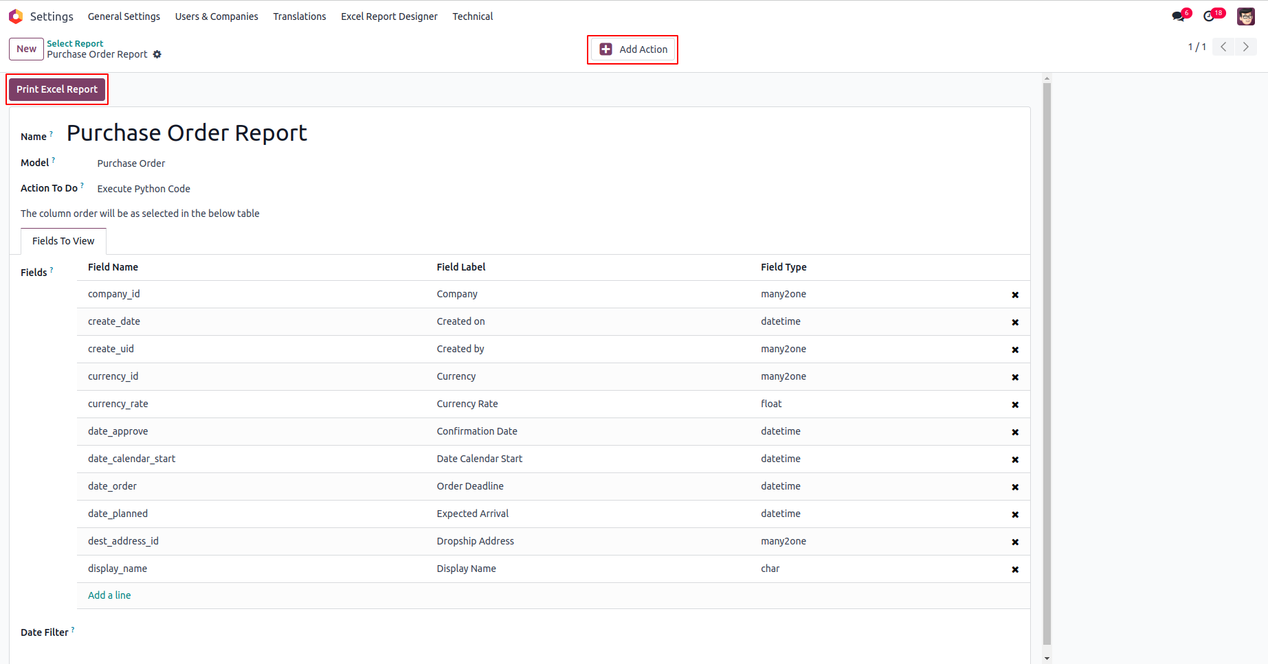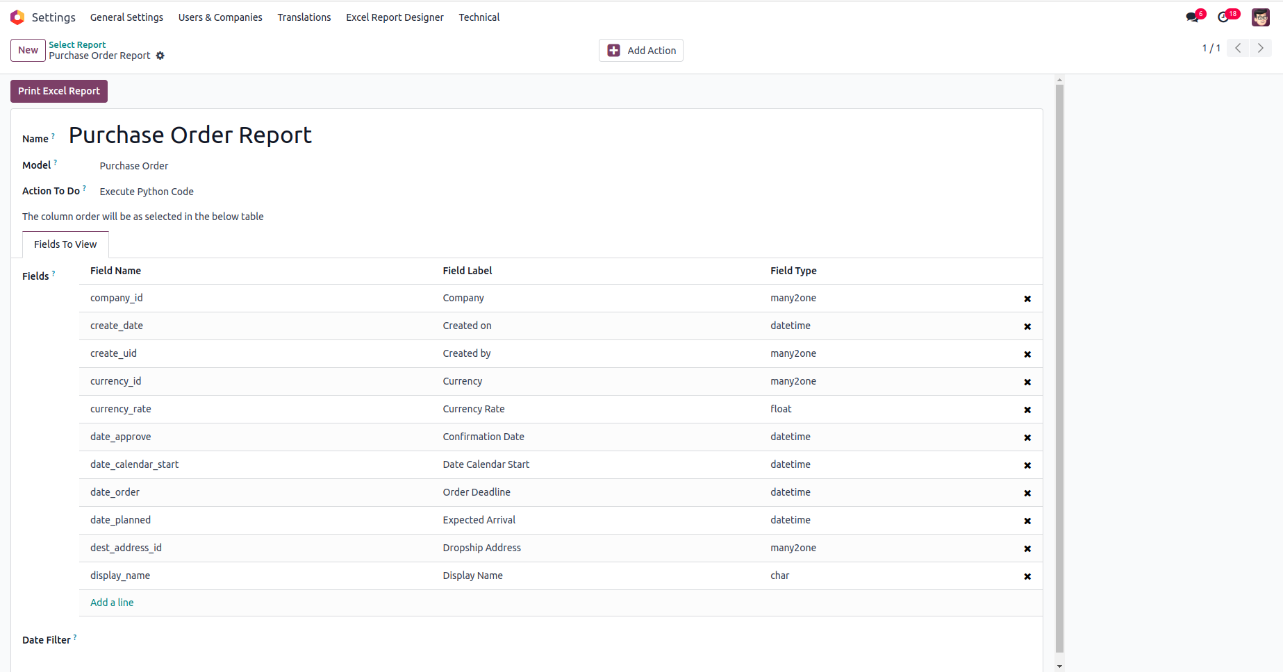 The reports can be configured and printed using the 'Excel Report Designer' menu at Settings. Select the desired model on which you want to create report, select the required fields and filter using any of the date field in the model.