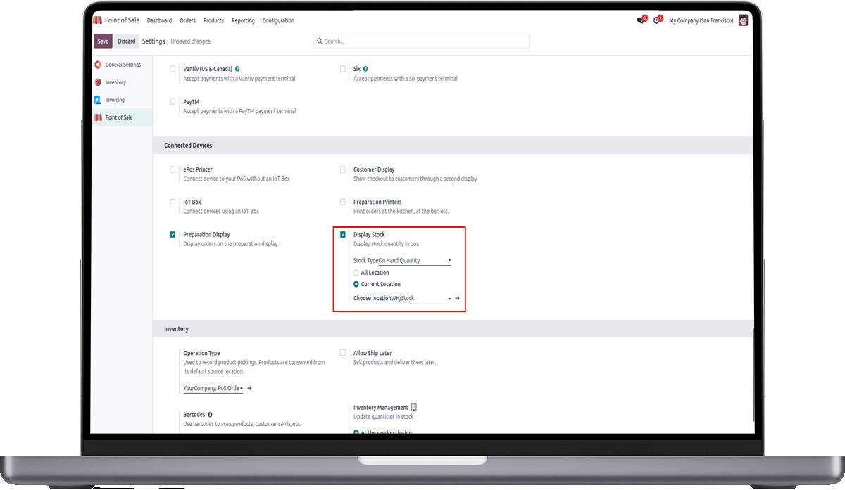 Go to Point Of Sale -> Configuration -> Settings -> Display Stock. By enabling this feature you need to choose stock type as well as Location.