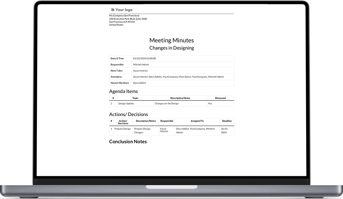 Allows to send Minutes of Meeting as PDF file via email to all attendees.