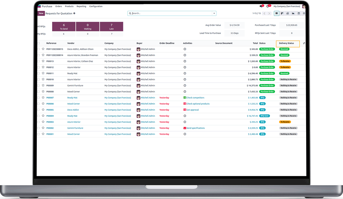 This module enables tracking of the delivery status for each purchase order, with the status displayed in both the tree view and form view of purchase orders. The available delivery statuses include: