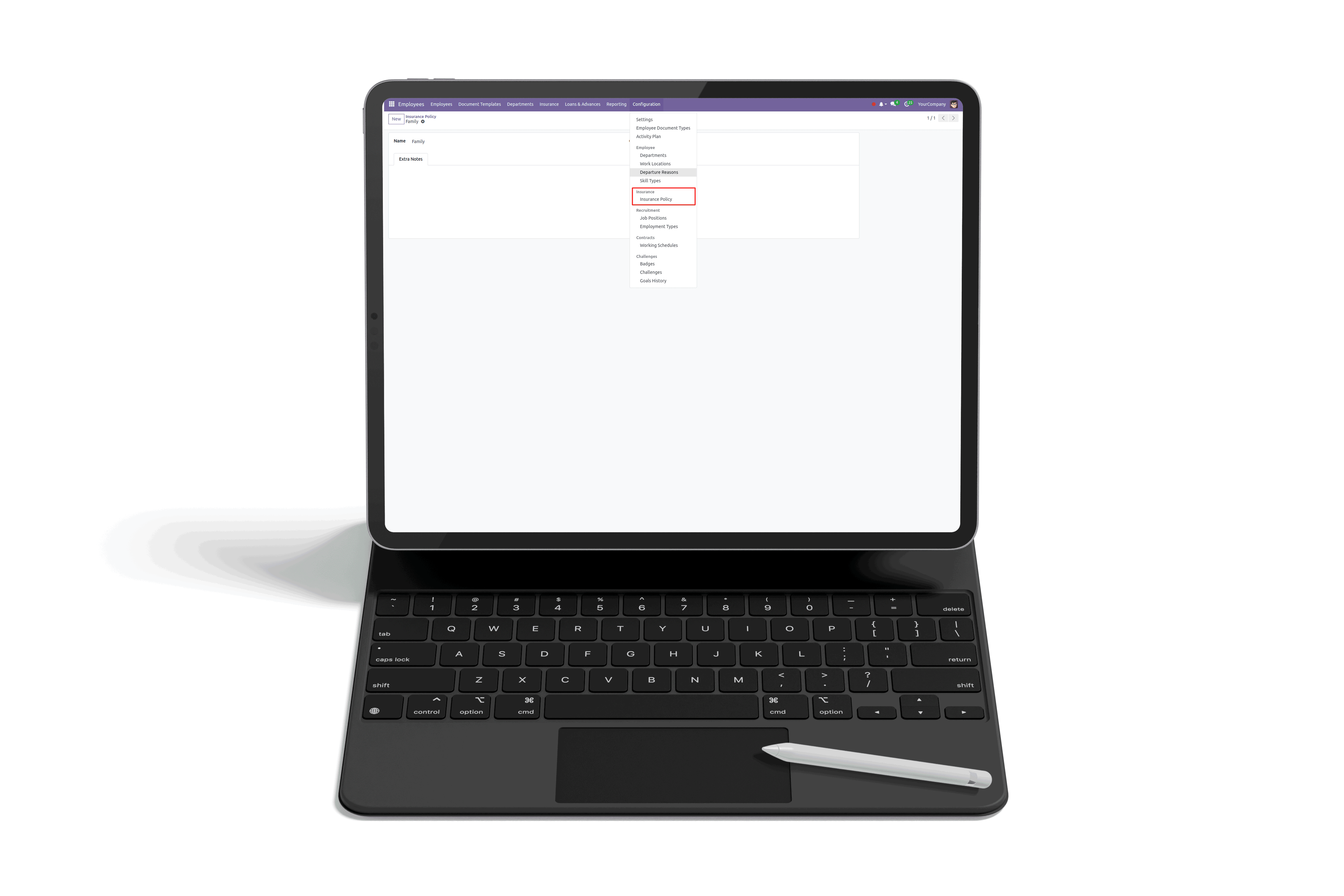Go to the Employee module, click on Configuration, and then select Insurance Policy to manage and configure employee insurance policies.