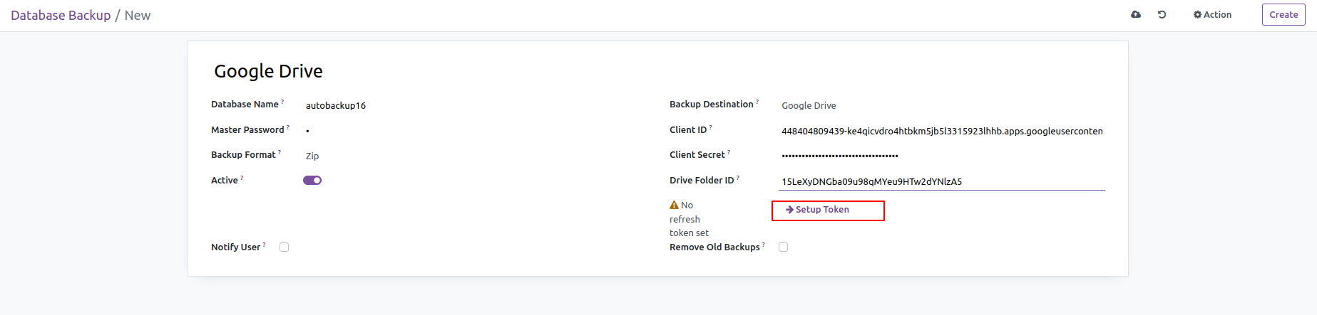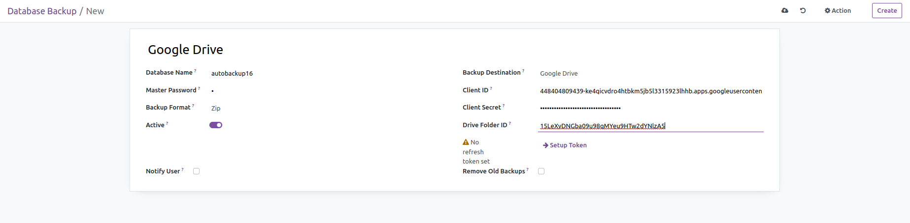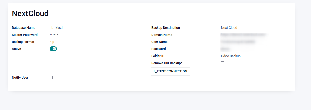 Every day, a Scheduled Action will take place to store a backup on the Nextcloud Server. The backup will be stored as the folder name provided in the Folder ID field in Odoo.
