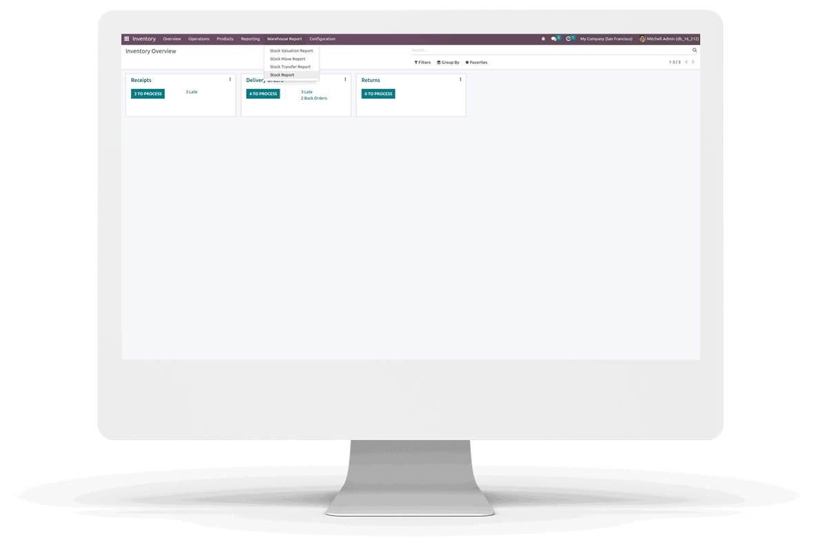 Go to Inventory -> Warehouse Report -> by clicking warehouse report we can get warehouse report submenus