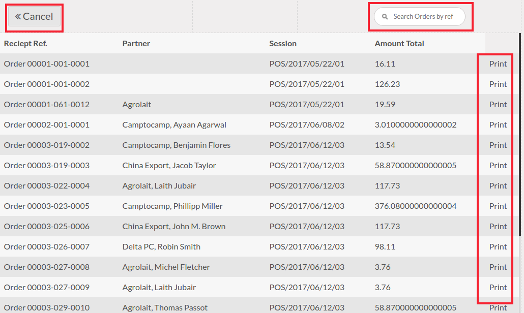 We can search orders by their reference. For each order, we can see a button 'Print'. By clicking on this button, we can see the details of that particular order.