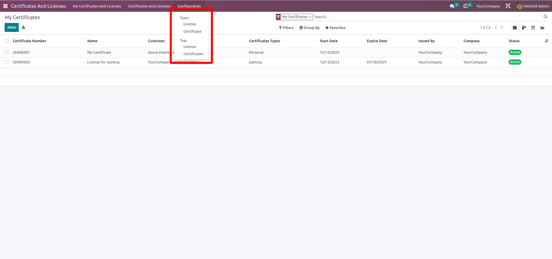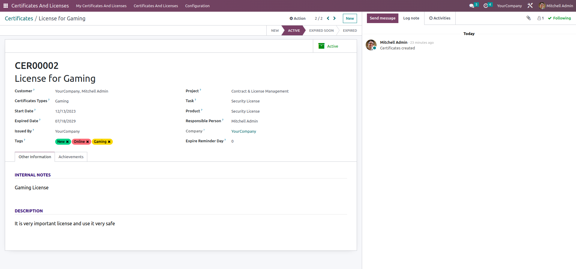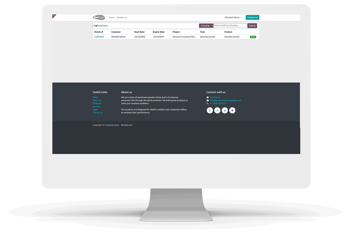 Certificate And License With Expiry Management Helps You To Manage Certificate And License Of Your Customers.You Can Manage All Certificate And License With Odoo.It Also Allows You To Manage Expiry Dates And Notifications