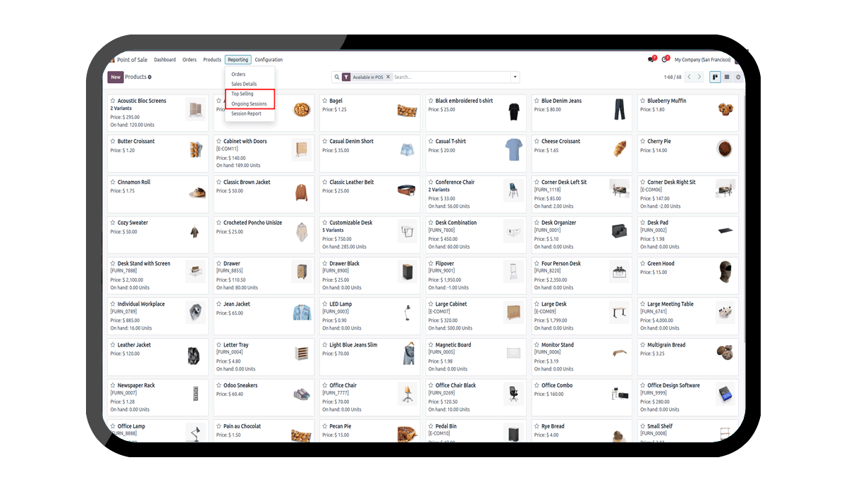 From Point of Sale --> Reporting, user can access the custom Reports like Top Selling and Ongoing Sessions.