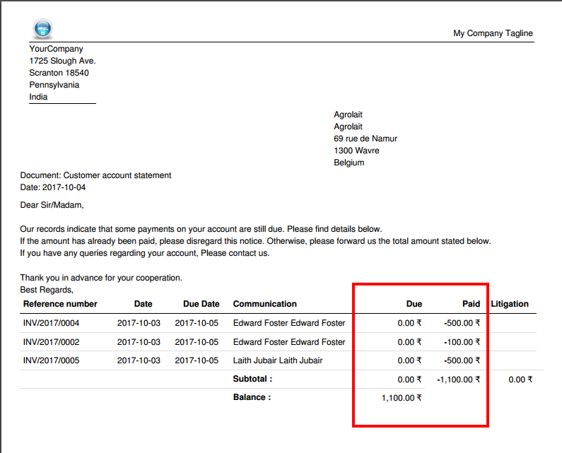 In odoo we can take the printout of customer due payment. This is a default feature. But in it, the calculated total due amount is wrong in the case of partially paid customer. For eg, a customer makes an invoice for an amount 2000. But he already made a partial payment of 1000 and when we take the customer due payment report, it will show the due amount as 2000. It doesn't consider the partially paid amount. So here we fixed the issue by correcting the calculation of the due amount.