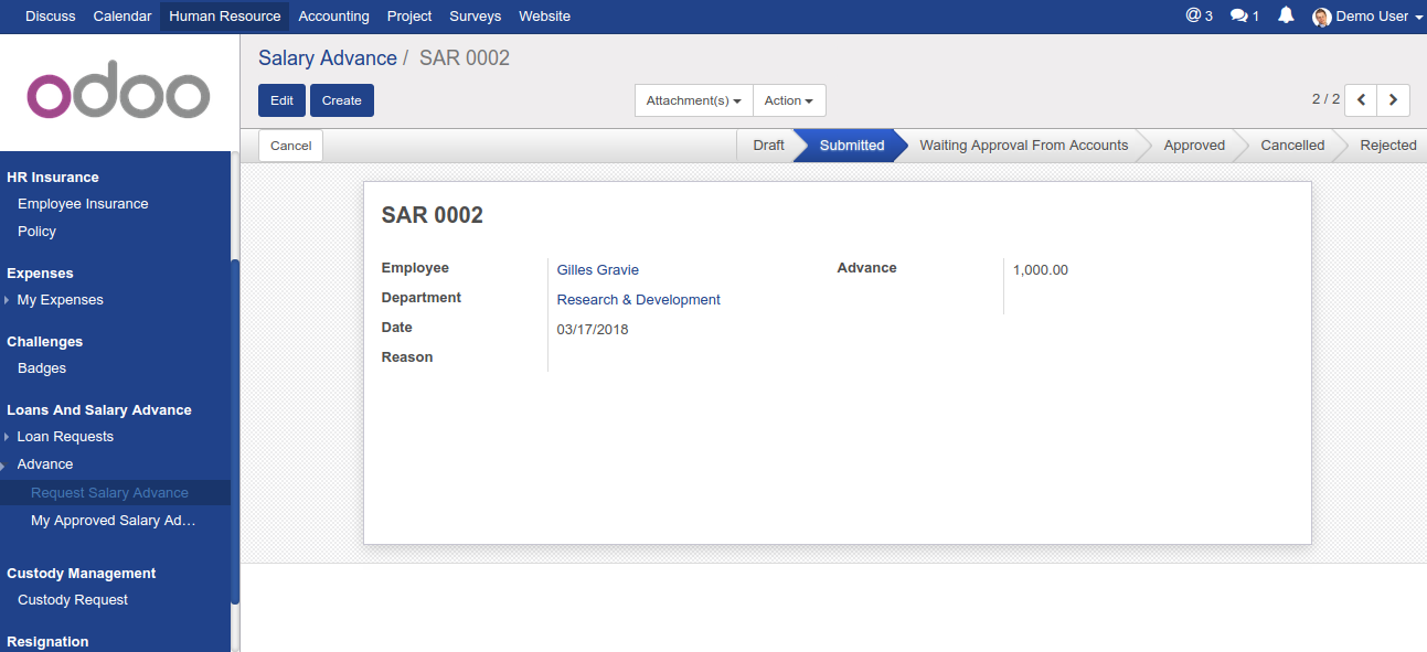 HR Salary Advance is a component of Open HRMS suit. HR Salary Advance module helps the user to manage salary advance requests from employees. You can configure advance salary rules, set advance salary limit, minimum number of days, and provide advance salary to employees