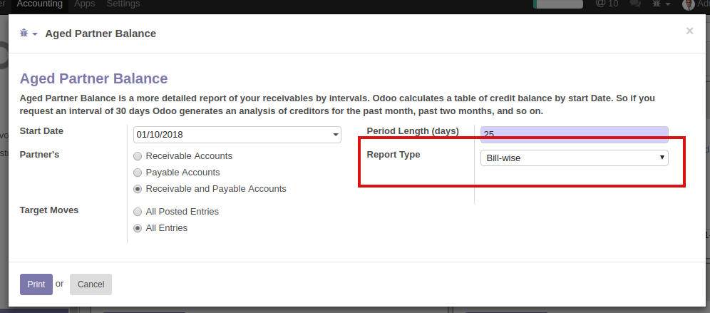 A new field is added to the aged partner balance wizard to specify the report type. We can have two types of reports, bill-wise or customer-wise. Bill-wise option will output a bill-wise aged partner balance and customer-wise option will output a customer wise aged partner balance report.