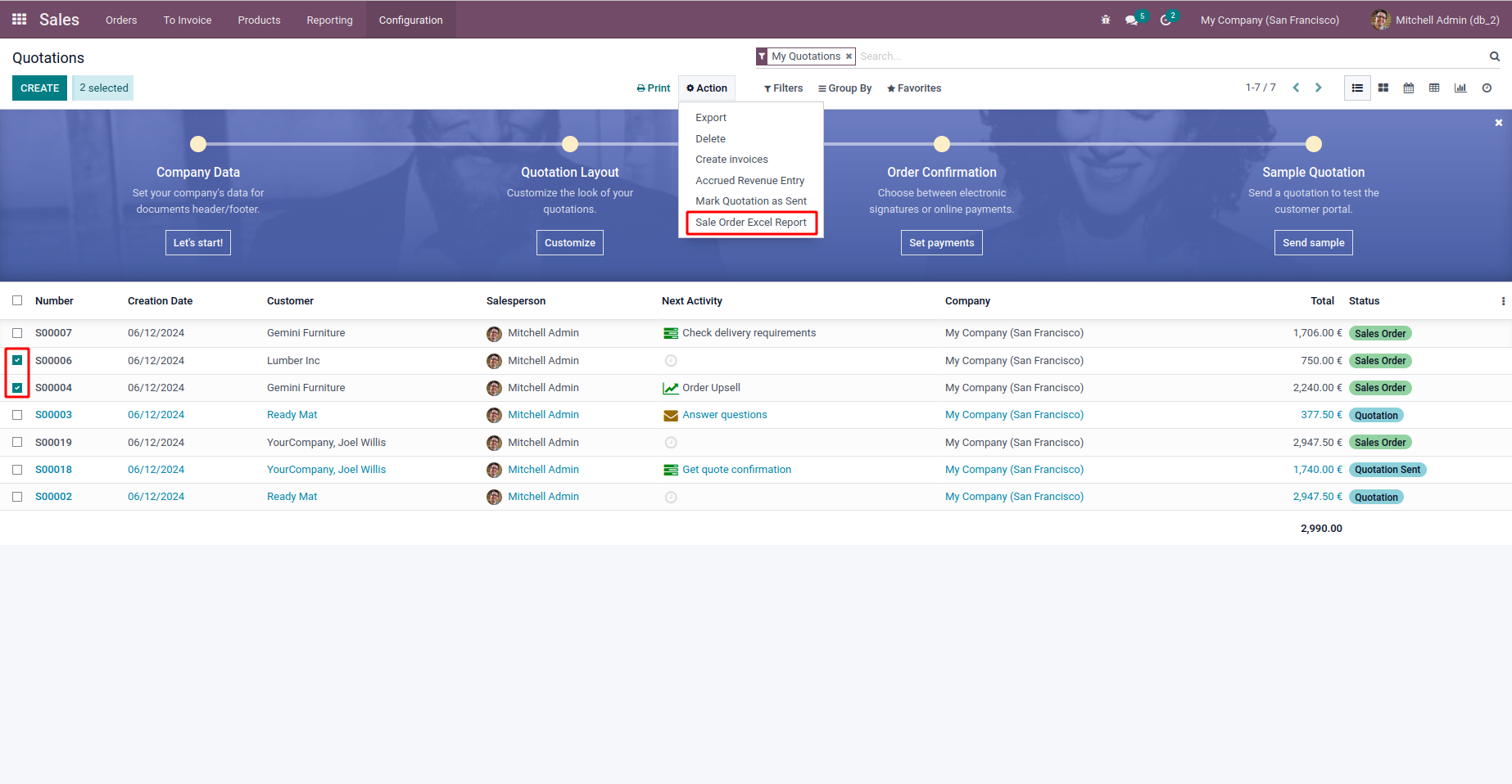 Go to Sales -> select records from the tree view for the sale order -> From the action menu -> Sale Order Excel Report