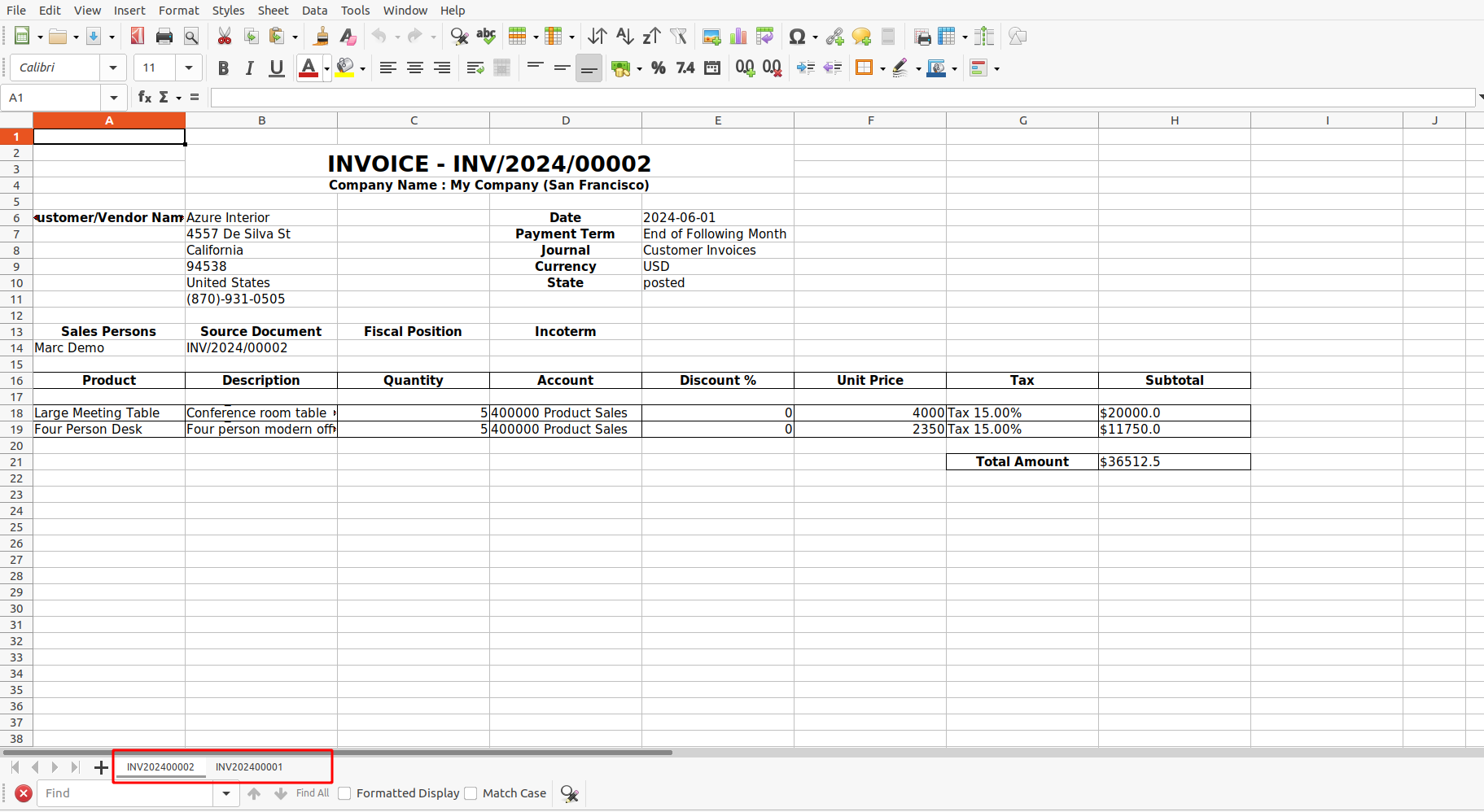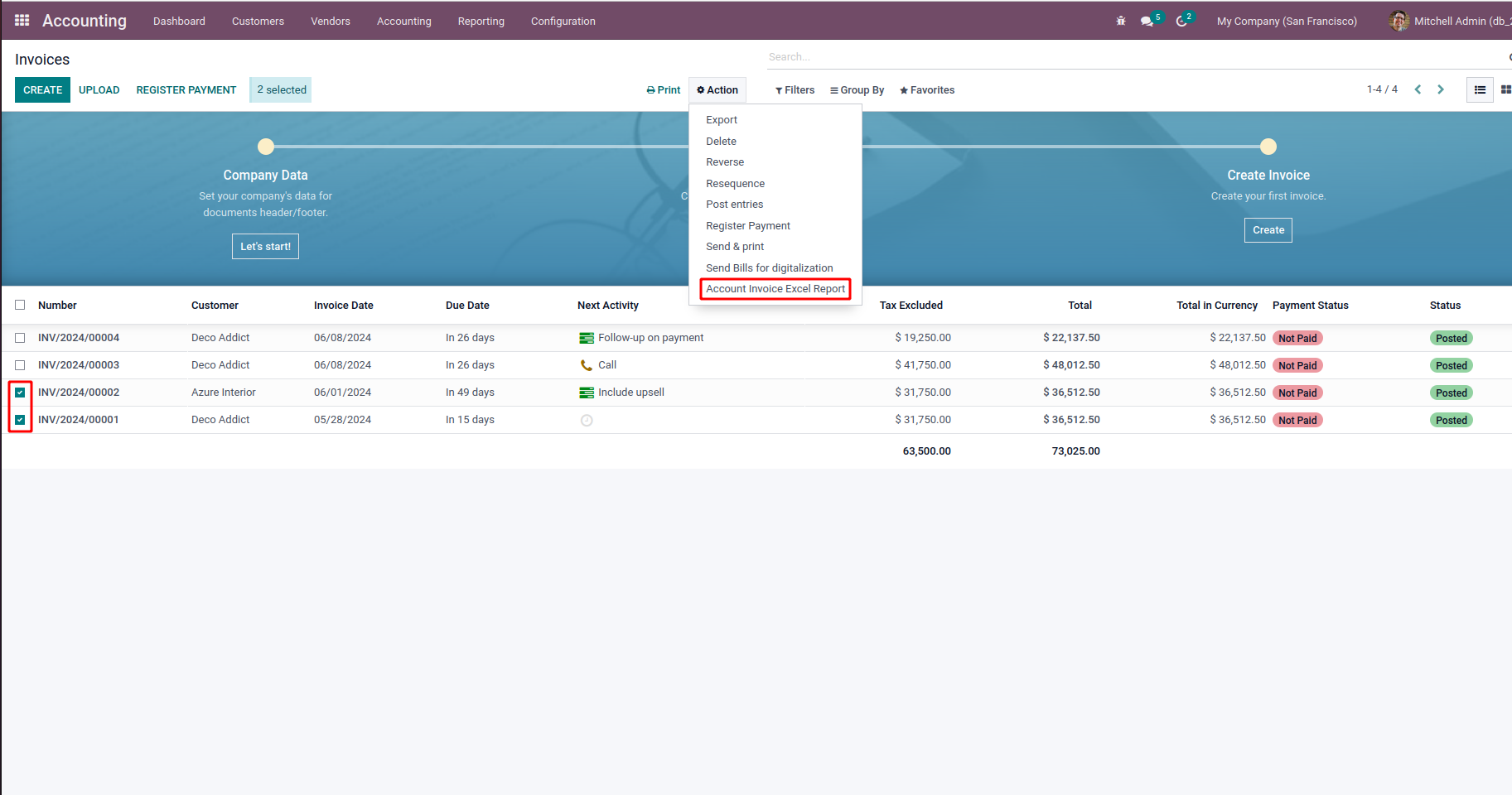 By clicking the Account Invoice Excel Report button we can print the Excel report
