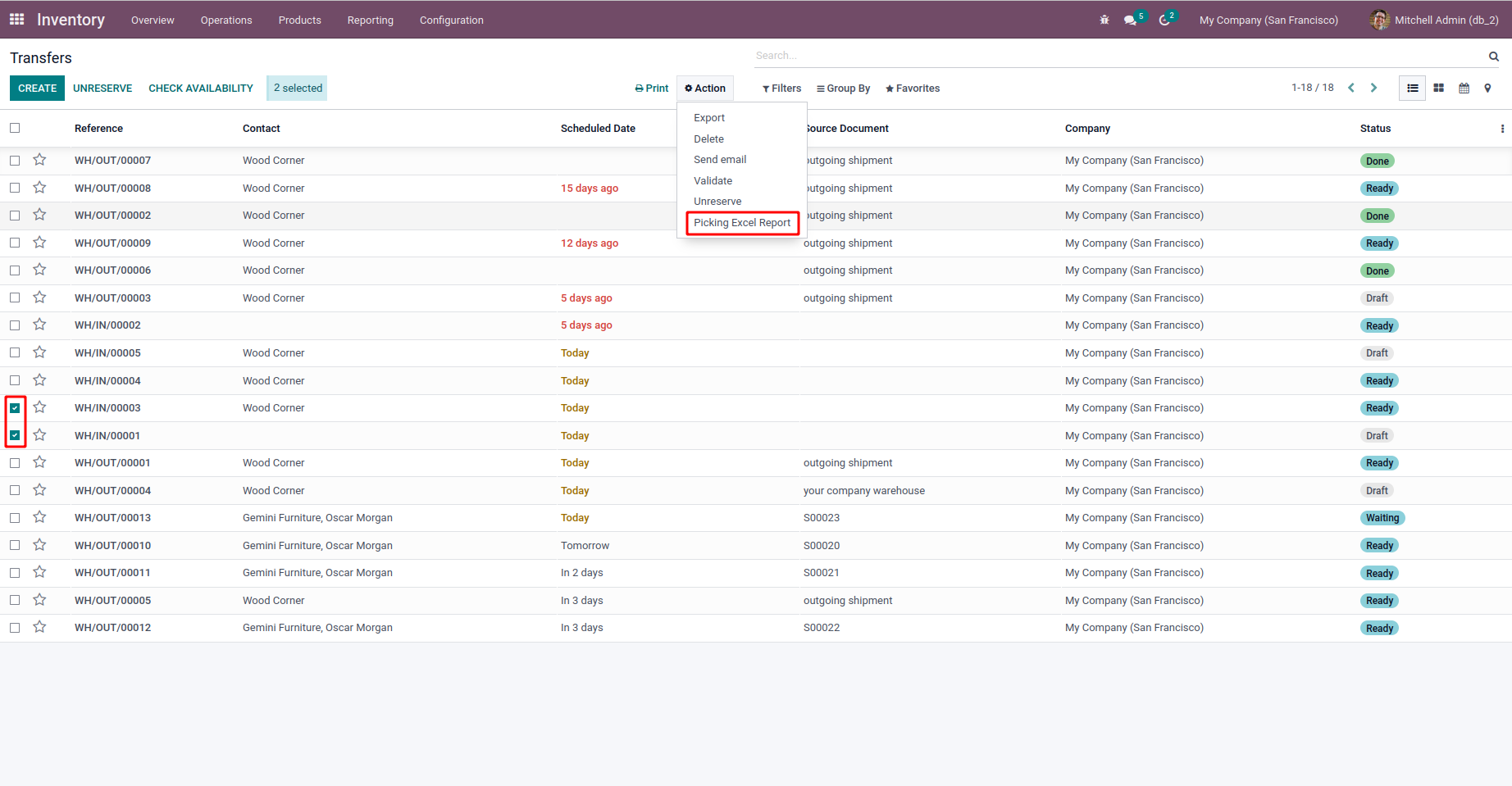 Go to inventory -> select records from the tree view for the transfer -> From the action menu -> Picking Excel Report