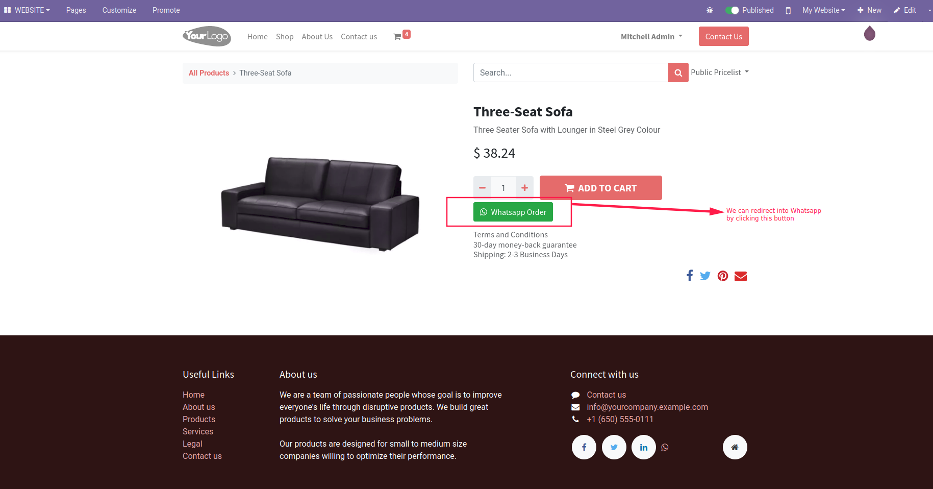 This module adds a WhatsApp button on the website of the selected product in which the customers can communicate with the website through WhatsApp about each product.
