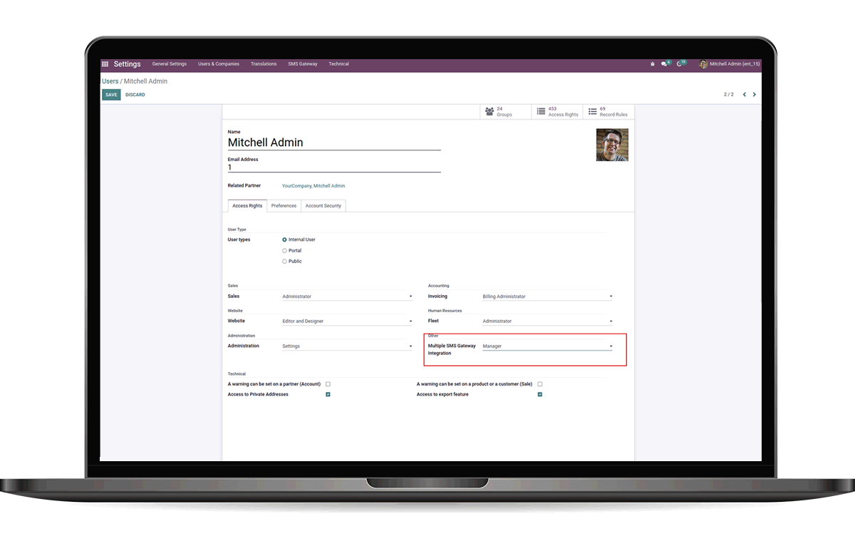 Select the access right for the Multiple SMS Gateway Integration module as Manager.
