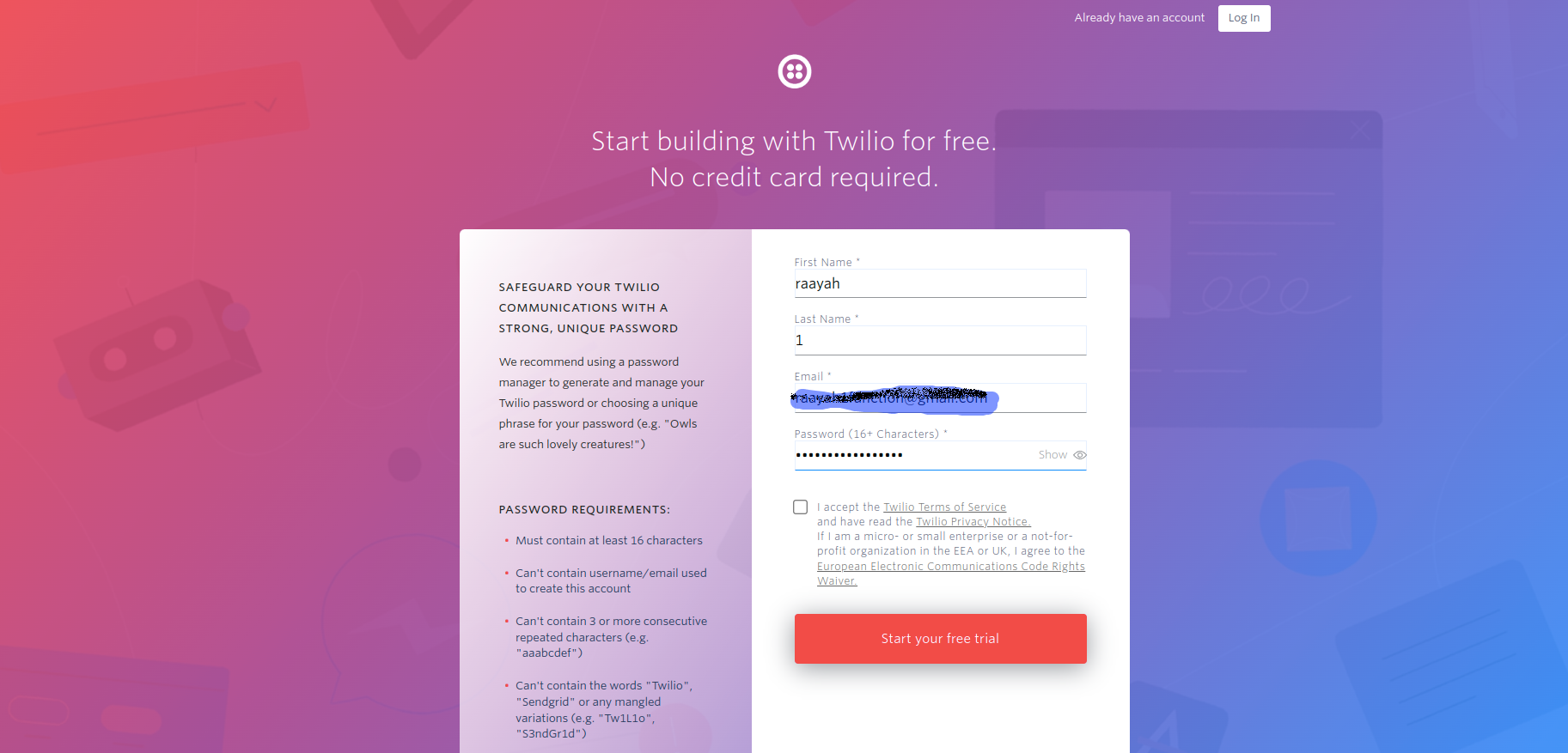 The credential for the gateway Twilio can be accessed by creating account in Twilio platform. To create Account in Twilio platform Click Here .Click start for free button