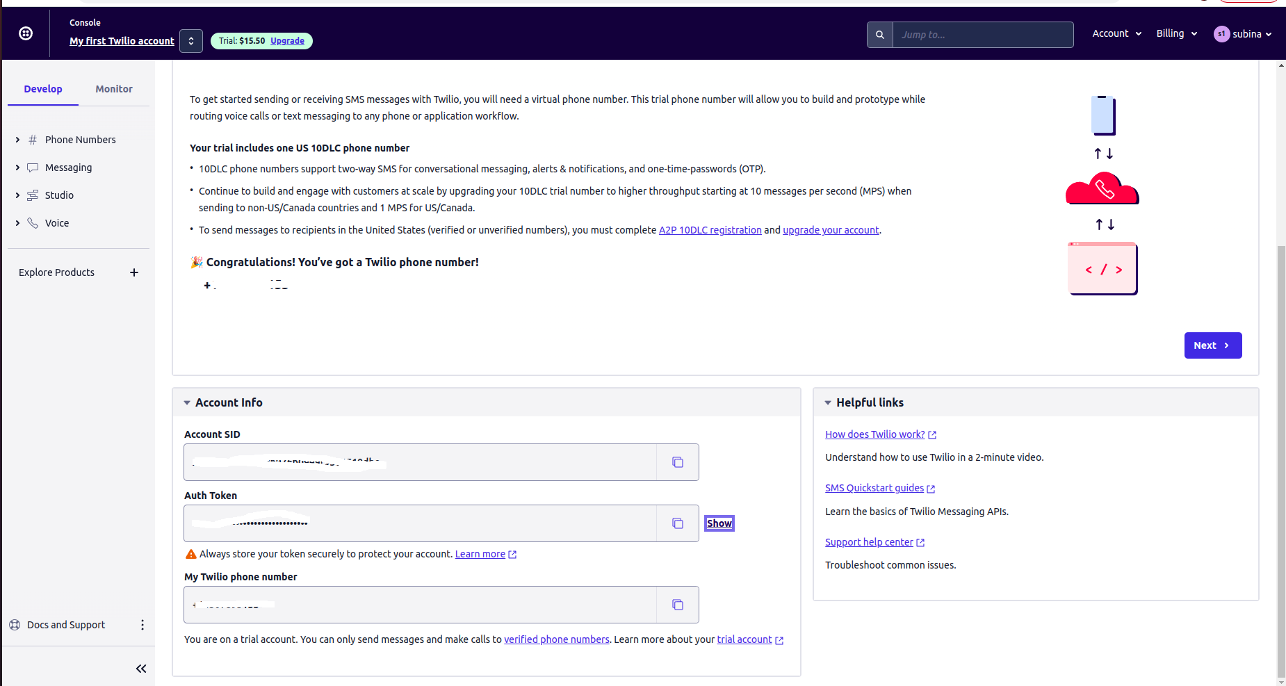 We get the credentials after that, And we can generate a twilio phone number by clicking on Get a phone number button