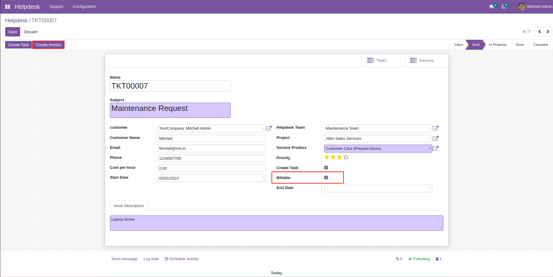 In the Helpdesk Support App, one can Create Ticket through website portal and can view their tickets. The Internal user can assign the ticket to any team and link to any project if needed and can invoice based on the timesheet