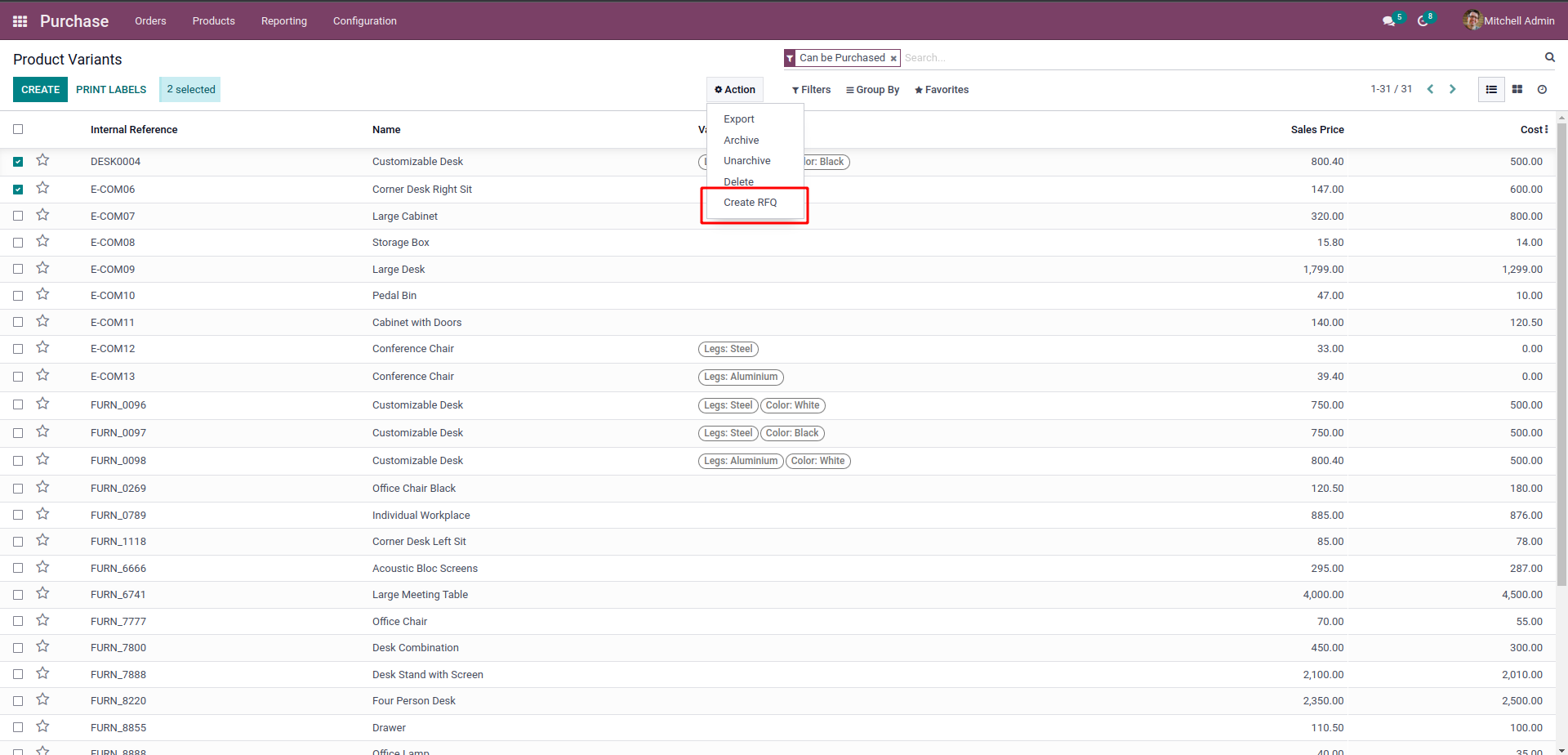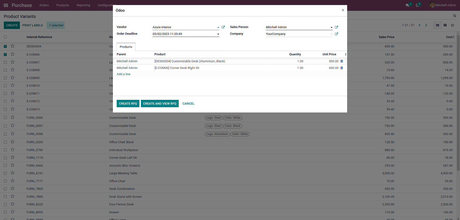 This module helps you to create quick RFQ from Products list.User can select multiple products from the Products list and create RFQ for the selected Products.
