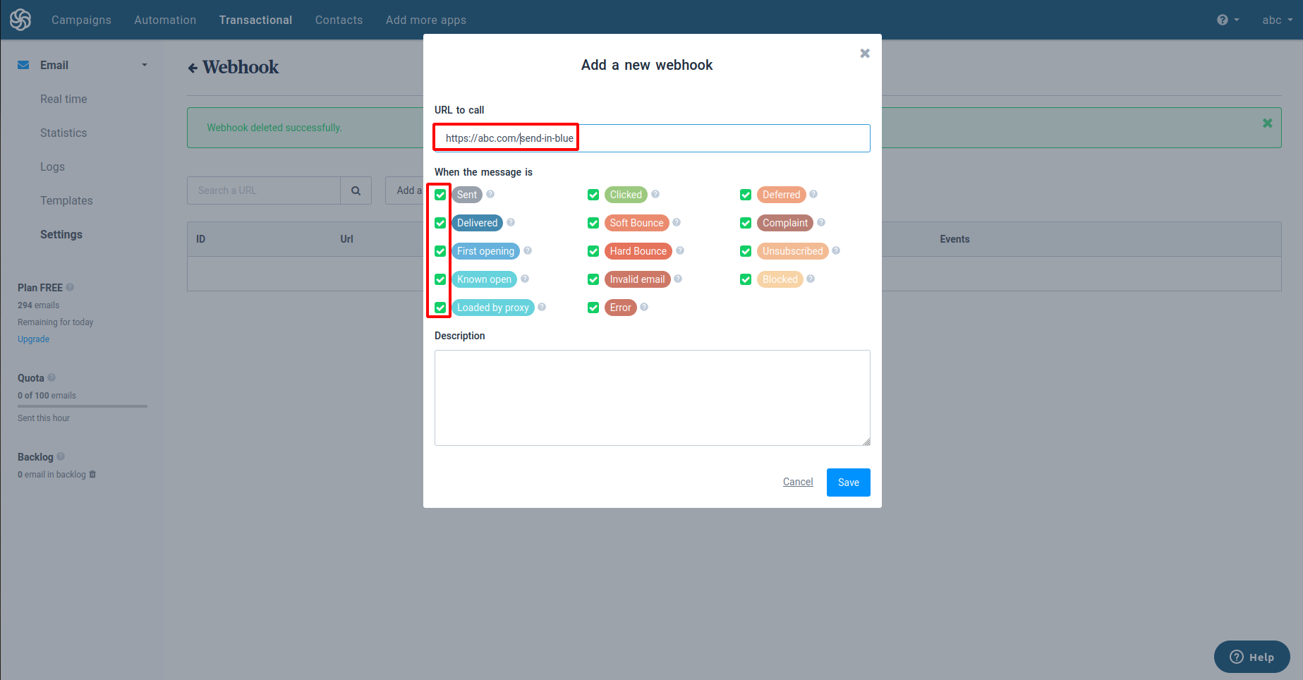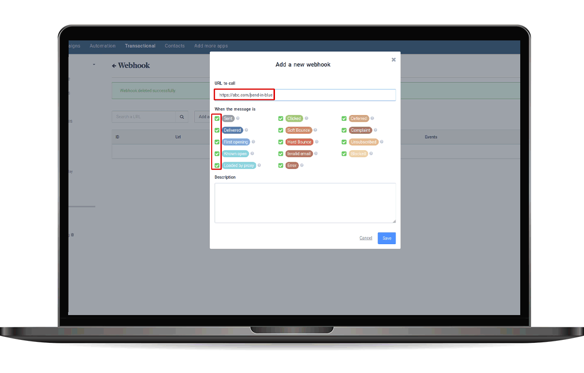 Sendinblue --> Transactional --> Setting -->Webhook --> Add a new webhook