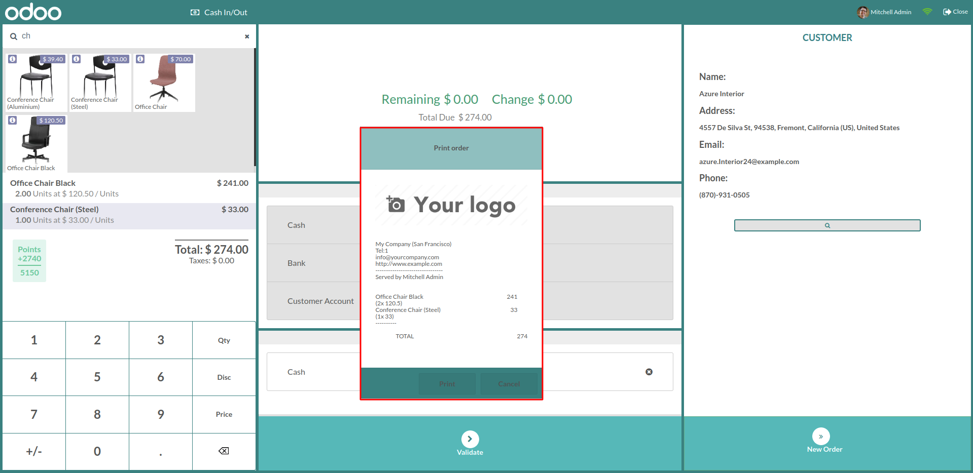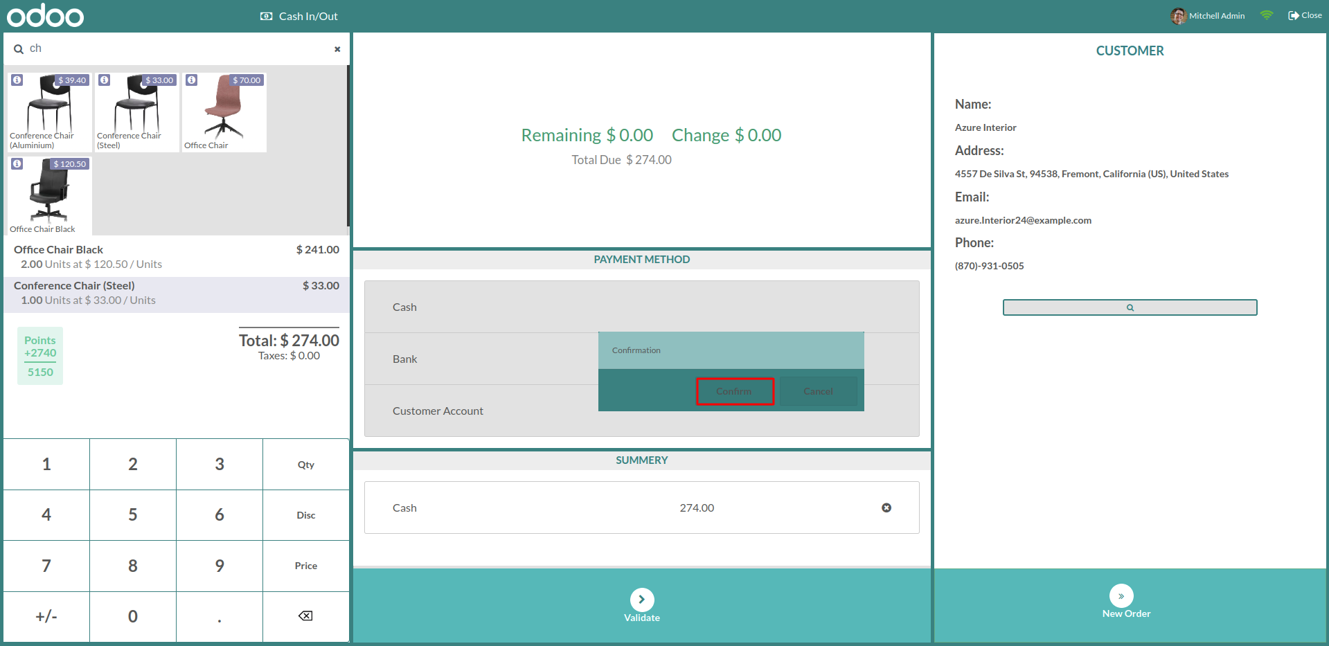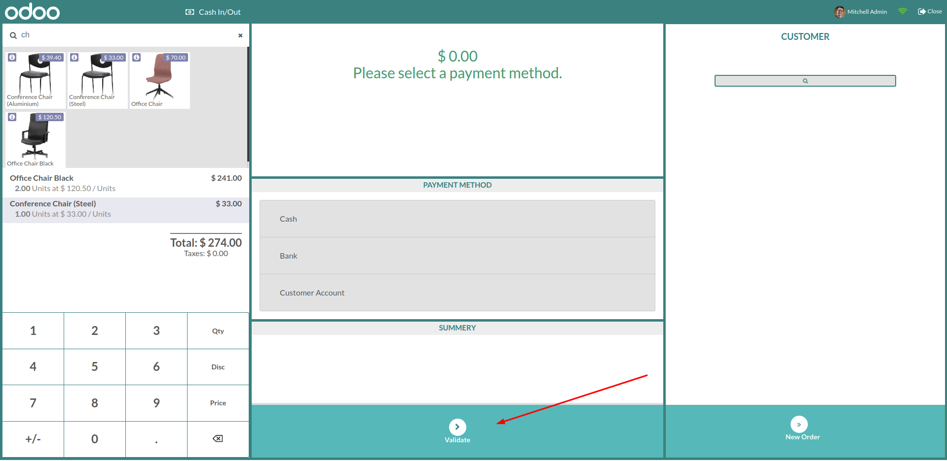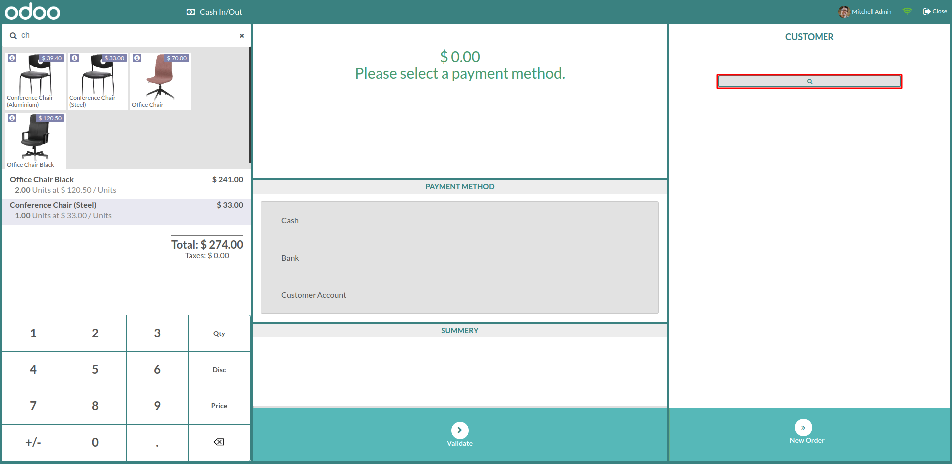 When a product is clicked, it is added to the order lines and the total is displayed beneath it. We can adjust the amount, price, and discount using the number pad.