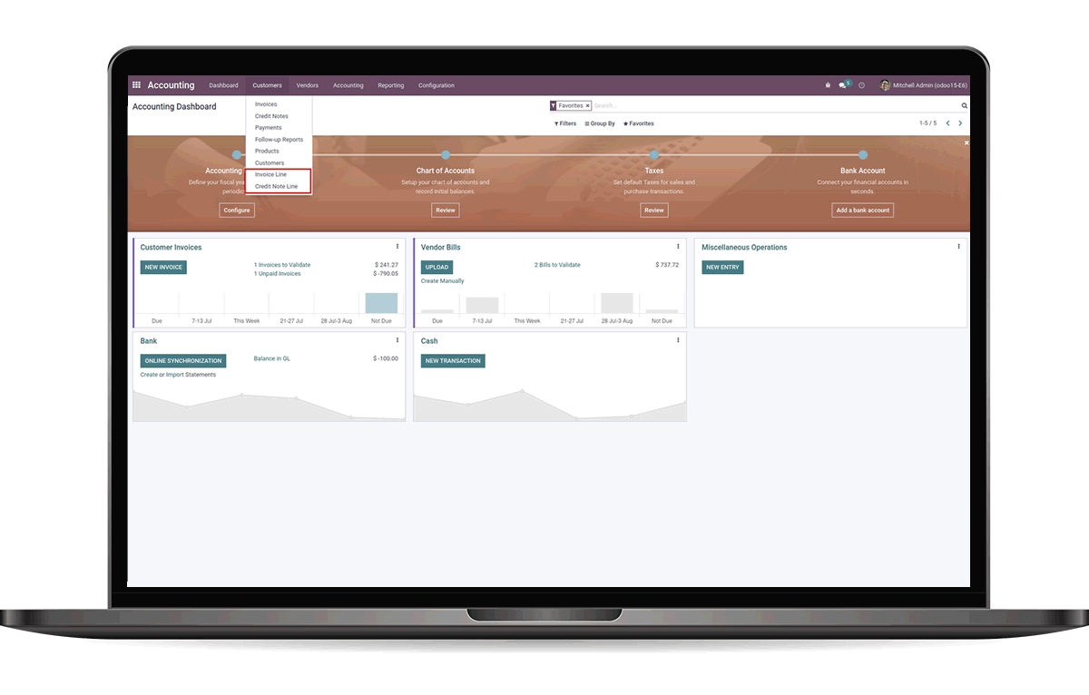 Go to Accounting/Invoicing >> Accounting >> We can see the Account Line and menu