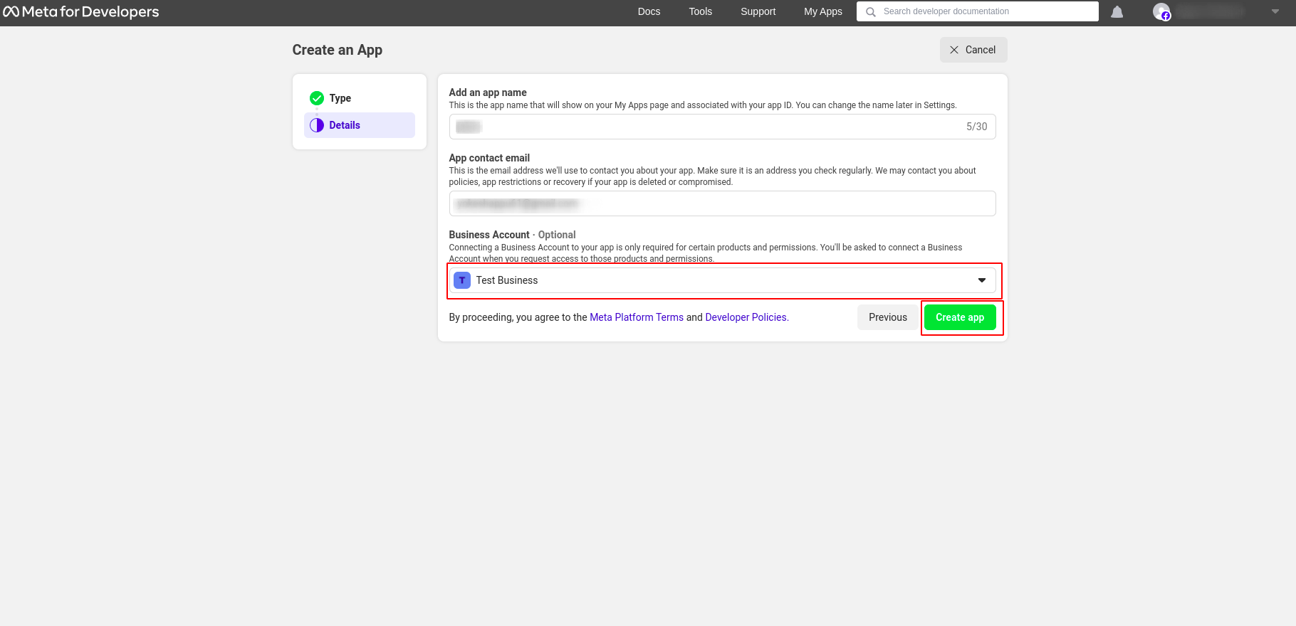 Provide App name and App contact email, select Business account as 'Test Business', click on Create App.