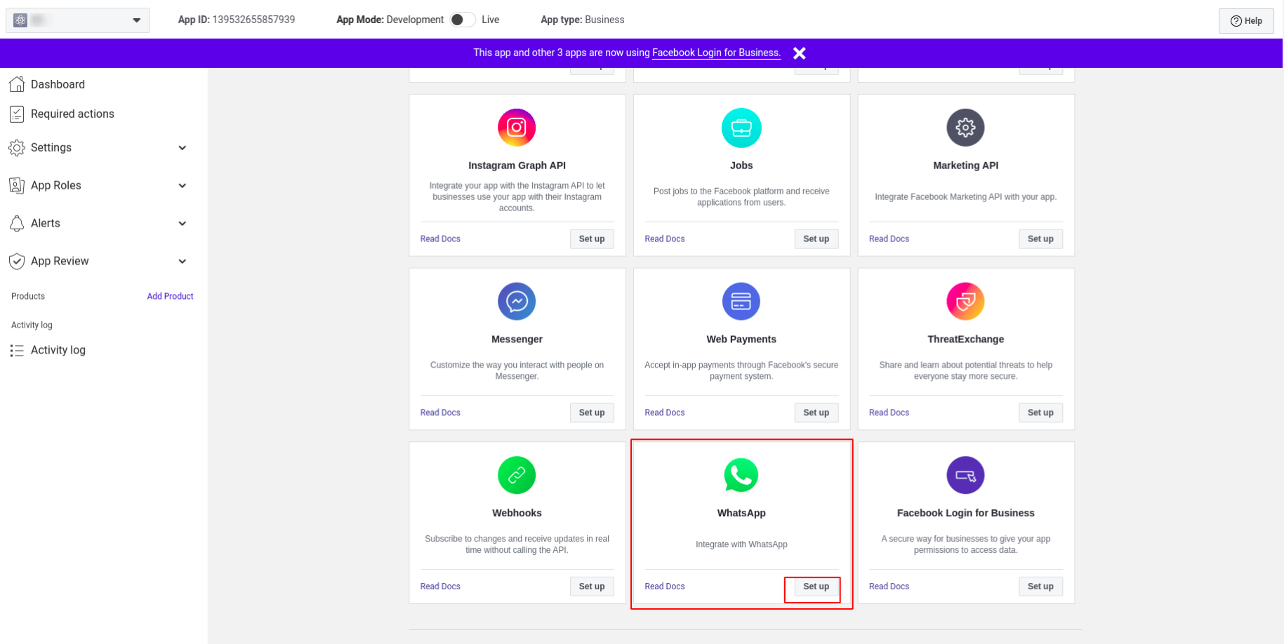 Then after we need to integrate the Whatsapp with our app that we created by clicking on 'Set up'.