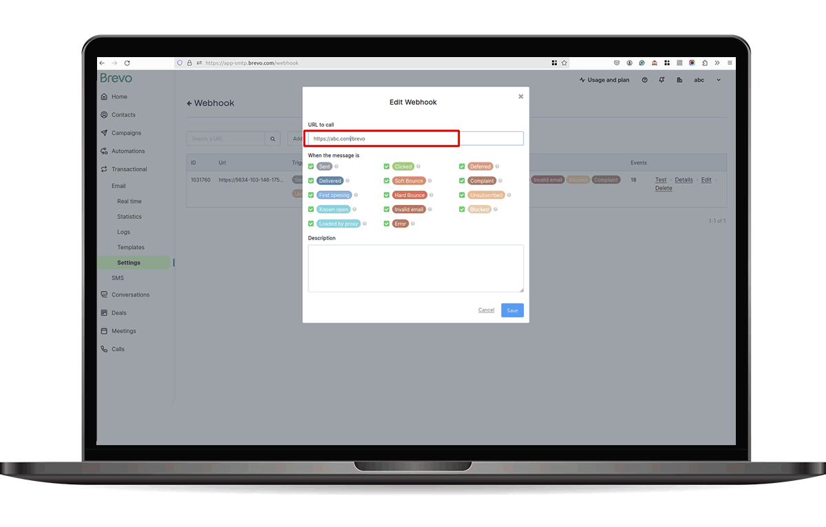 Brevo --> Transactional --> Settings -->Webhook --> Add a new