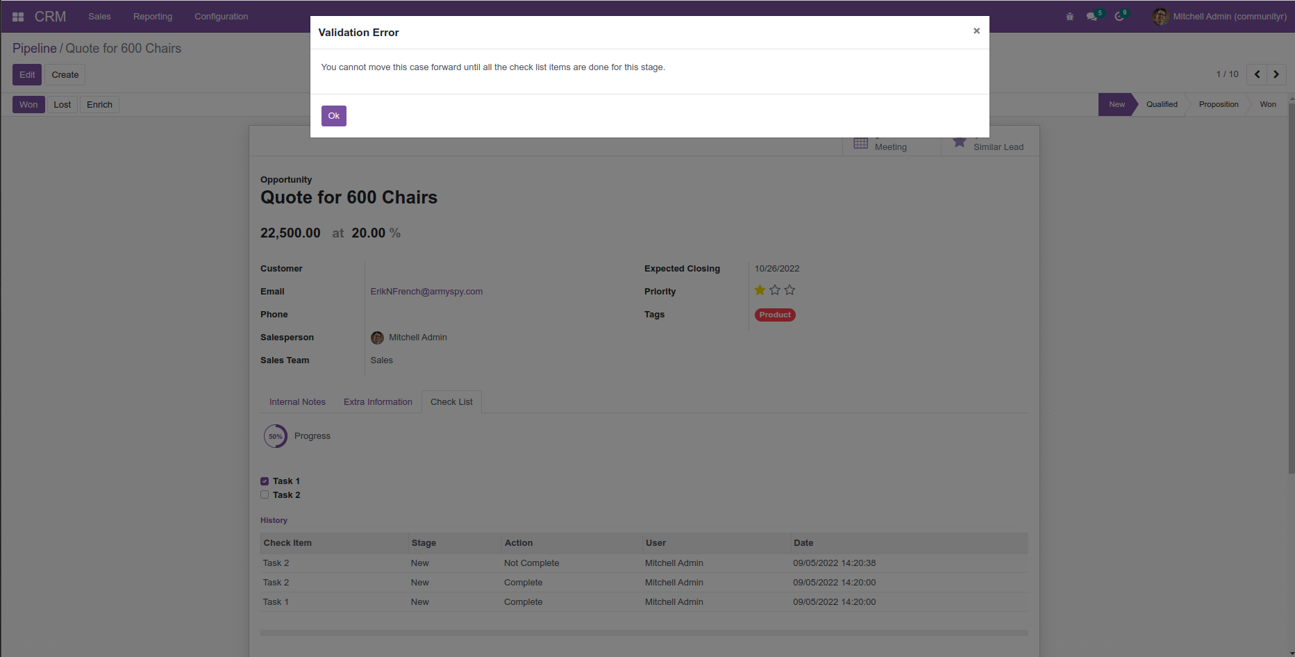 The opportunity can be only progress to upper stages if the checklist items are fully completed to the selected user/team.