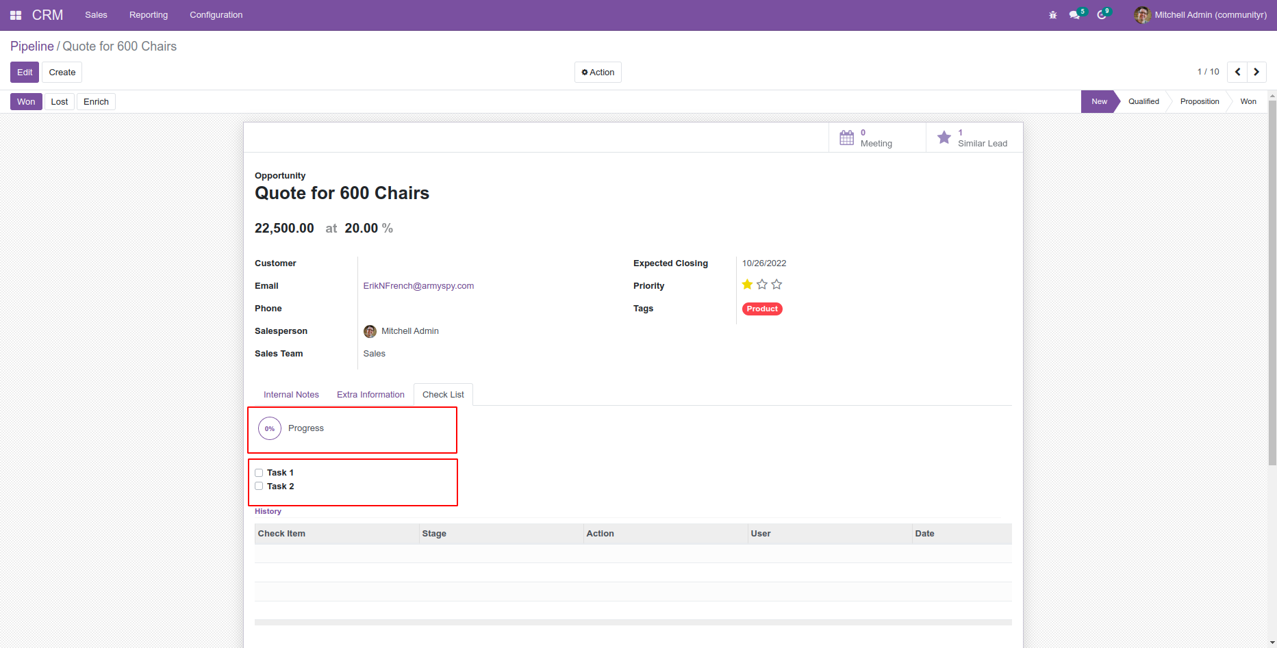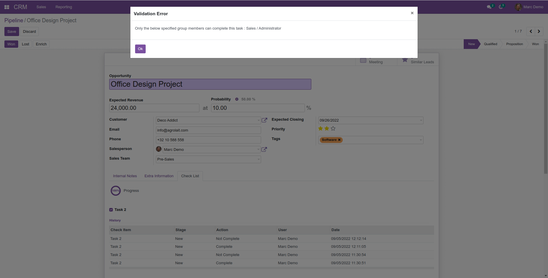Making a customer from an opportunity is the goal of the CRM pipeline. To achieve that goal sales staff needs to undertake a specific sequence of actions or tasks. Each of those actions is important on the defined stage. For working as an efficient company The CRM is an important part. This app provides a checklist for each pipeline stage to control requirements, fulfillment and to make sure that each action/checklist item is fully approved by responsible users. So that it will be easier to manage through CRM pipelines.