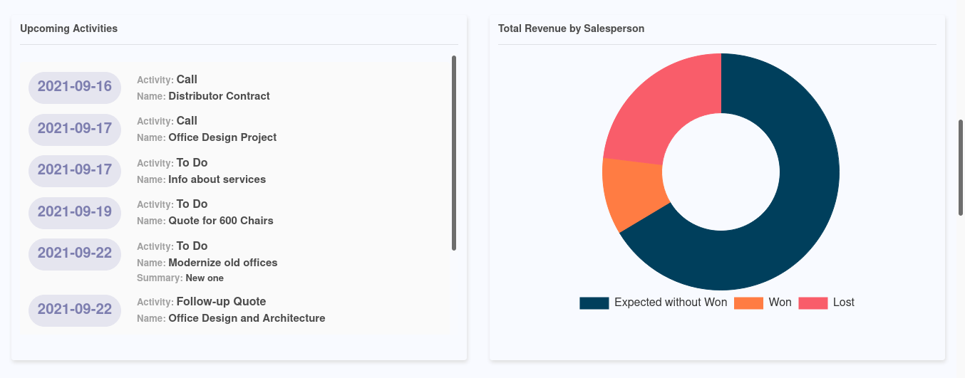 A dedicated Funnel Chart provides you with complete insight into the Leads which are in operation. The leads will be depicted as New, Qualified, Proposition, and Won. Moreover, the Year date target will provide an insight into the goals which are achieved. The Donut graph based on the monthly Lead operation will provide a clear picture of the monthly Lead operations. Additionally, the Activity Donut graph will describe the activity analysis on the leads.
