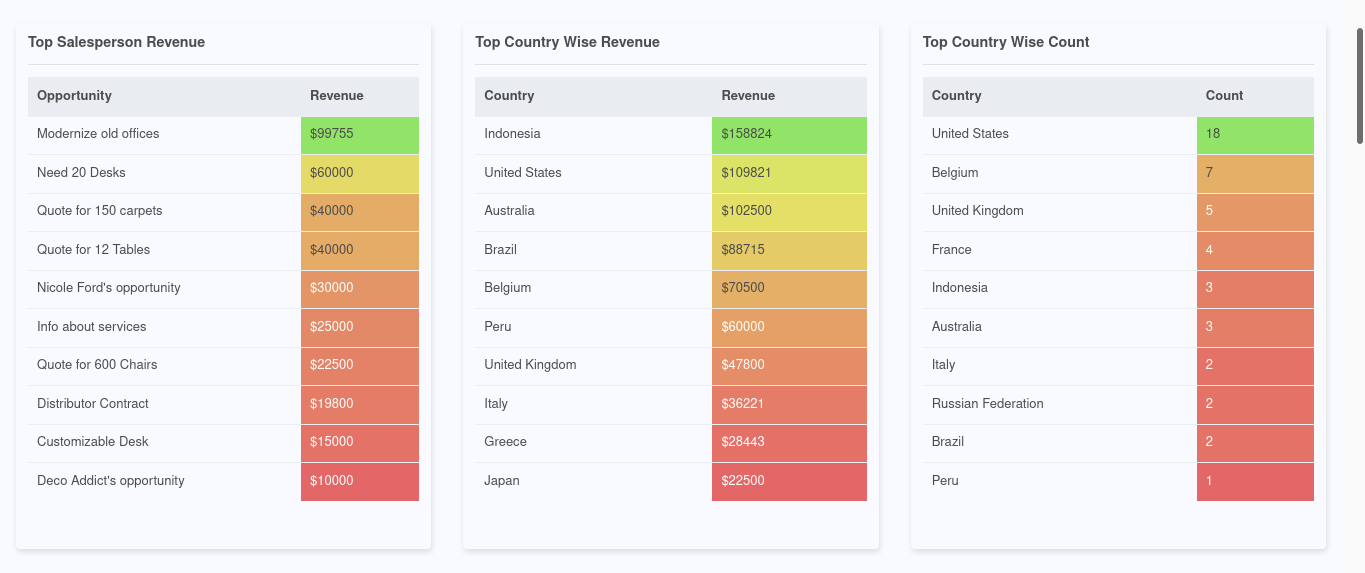 In the CRM Dashboard, you will obtain an informative heat map on the aspects of the Revenue obtained based on the CRM operations. Here the Top Salesperson, as well as Top Country Revenues, will be depicted with a color-coordinated Heat map providing clear insight on the financial values of revenue which is being generated. Moreover, a detailed tab will provide the information on the country-wise count on the opportunities which are being attained. The Country-wise count is also depicted on a heat map.