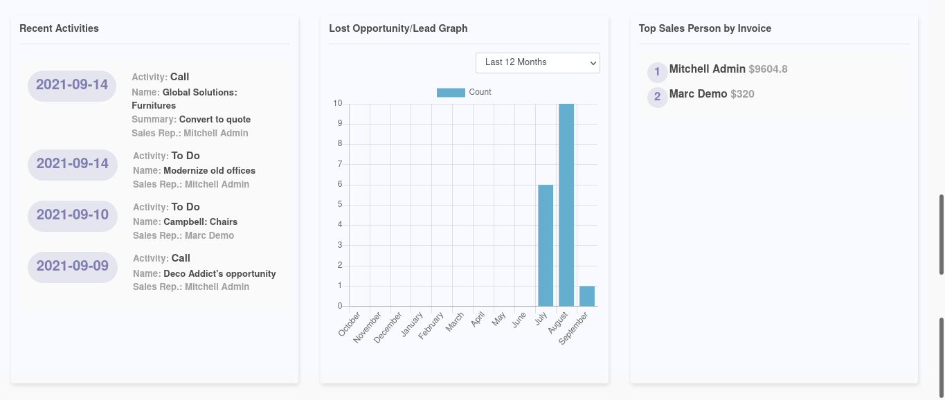 You will get an insight on the lost opportunities and Leads from the Lost Analysis Graph providing a clearer insight based on year or month. The Recent Activities description tab will provide a complete insight on the Activities which have been scheduled and conducted recently in regard to the Customer Relationship management operations on the pursuing of Leads and Opportunities.