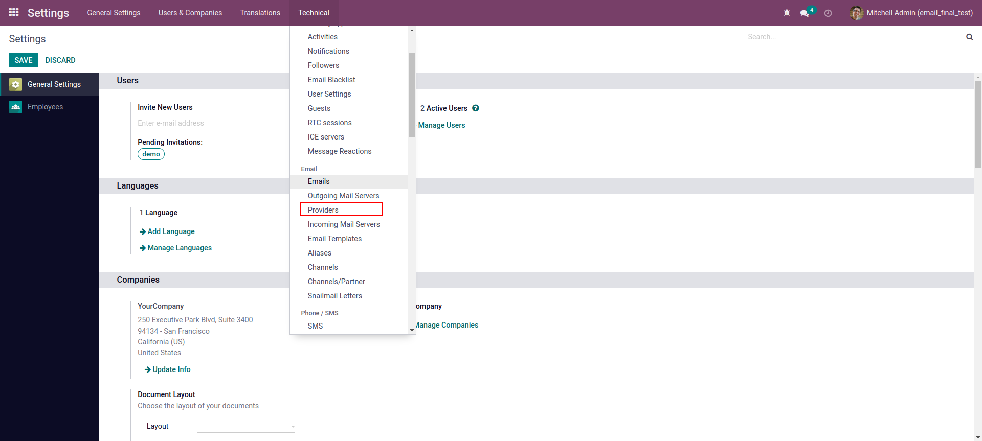 To create Providers, navigate to Settings -> Technical -> Providers.
